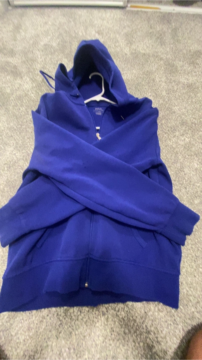 Selling a blue Polo Ralph Lauren zip-up hoodie. It's in used condition, but still has lots of life left! A cozy and classic piece for your wardrobe.
