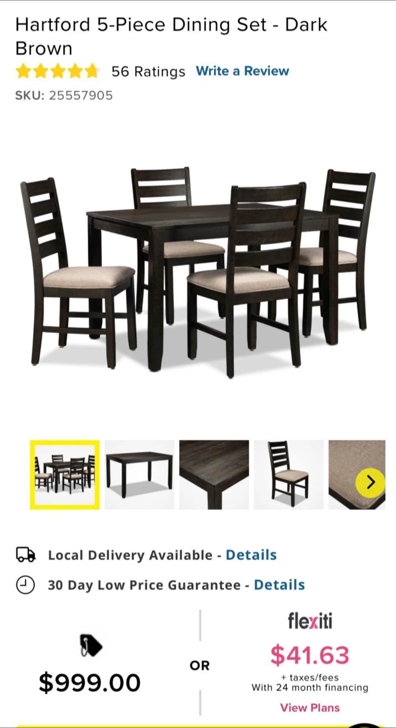 Beautiful dining set from Leon’s. Comes with a table and 4 matching chairs—all in very good condition. You can put one chair on each four sides of the table, or 2 chairs side by side as pictured.
