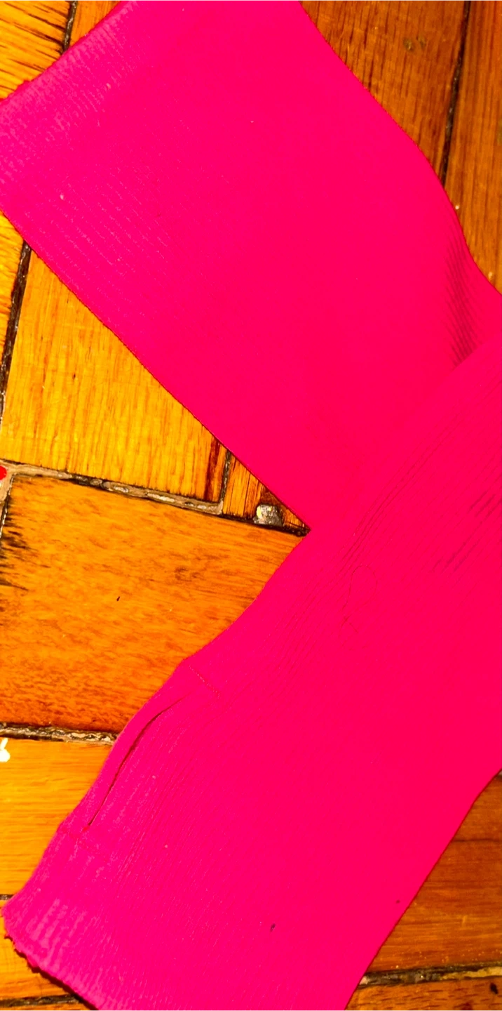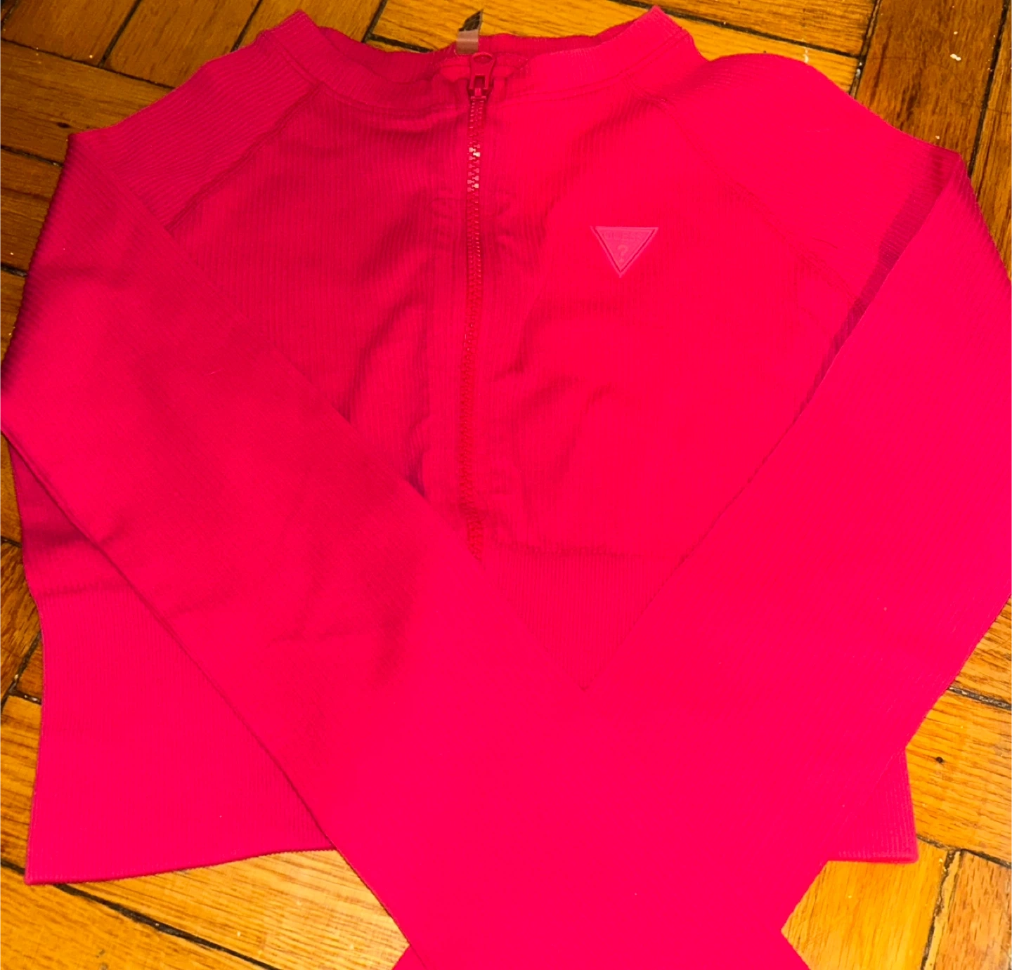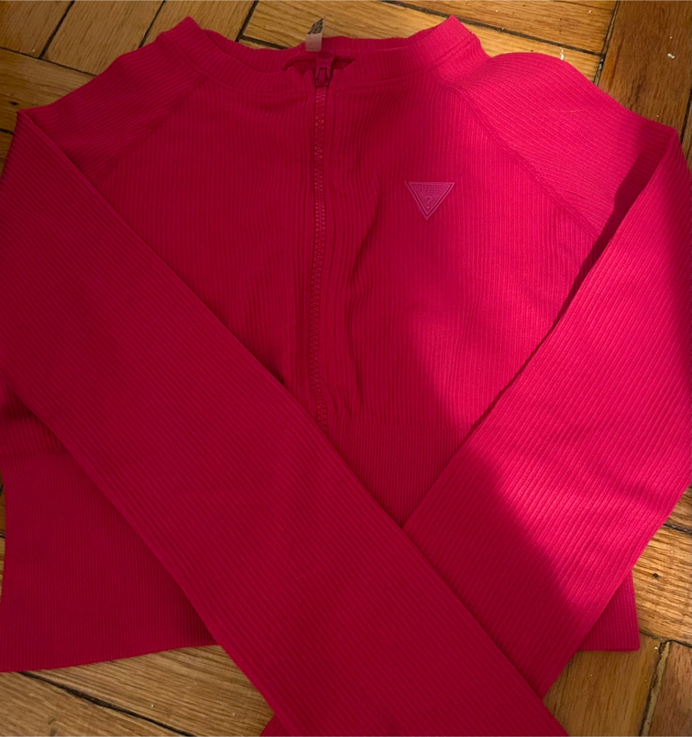 This is a bright pink Guess zip-up long-sleeved top. It's a ribbed knit material. Tag reads XS/S.