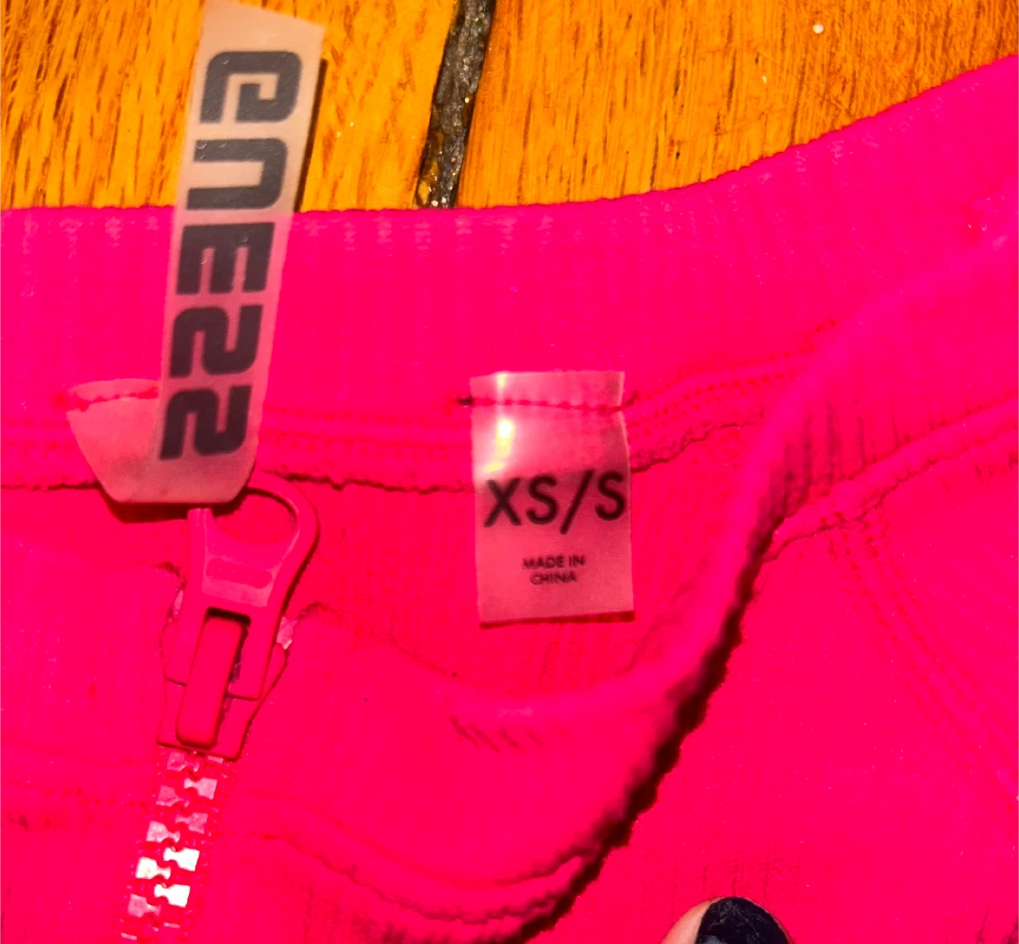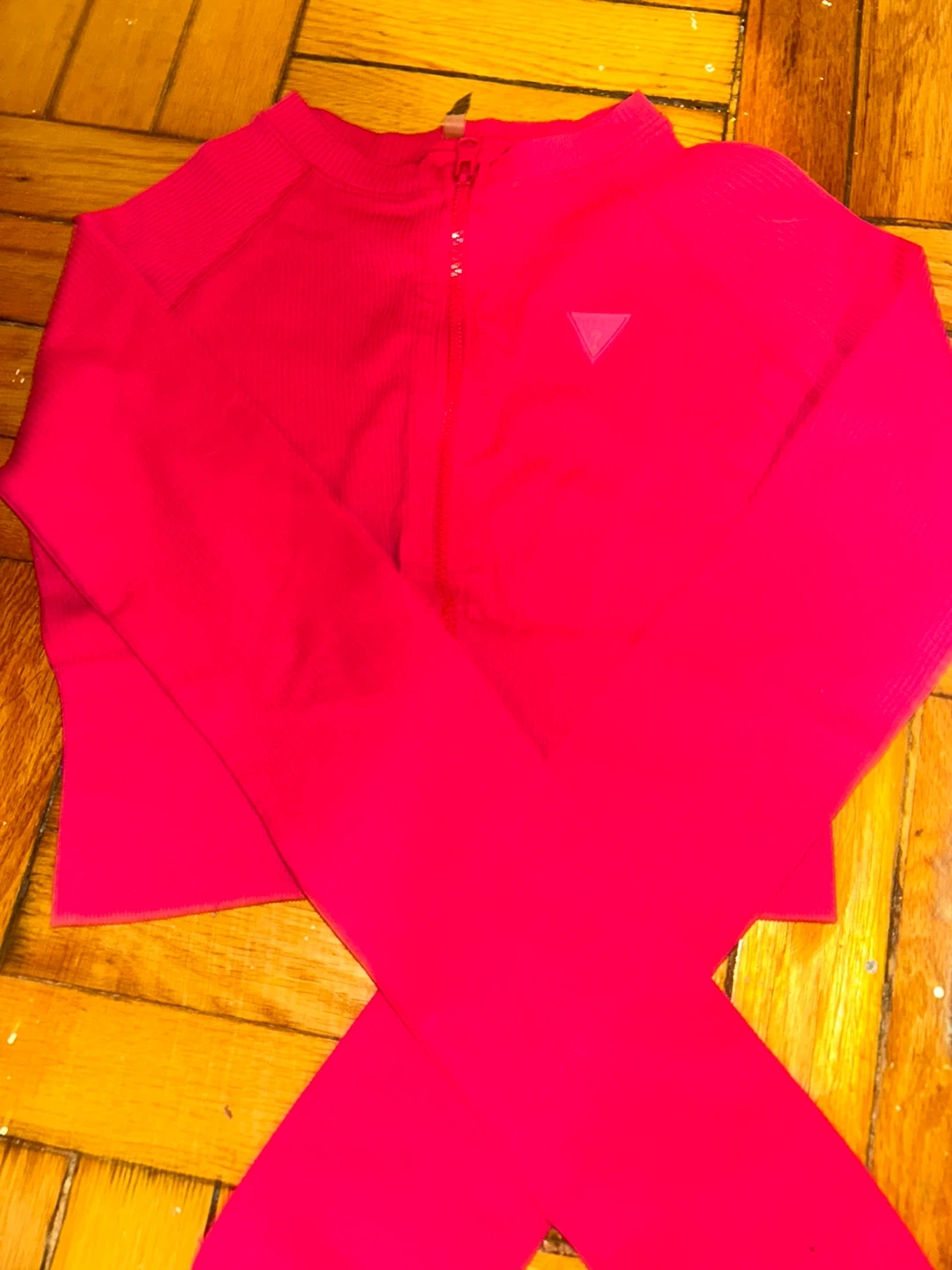 This is a bright pink Guess zip-up long-sleeved top. It's a ribbed knit material. Tag reads XS/S.