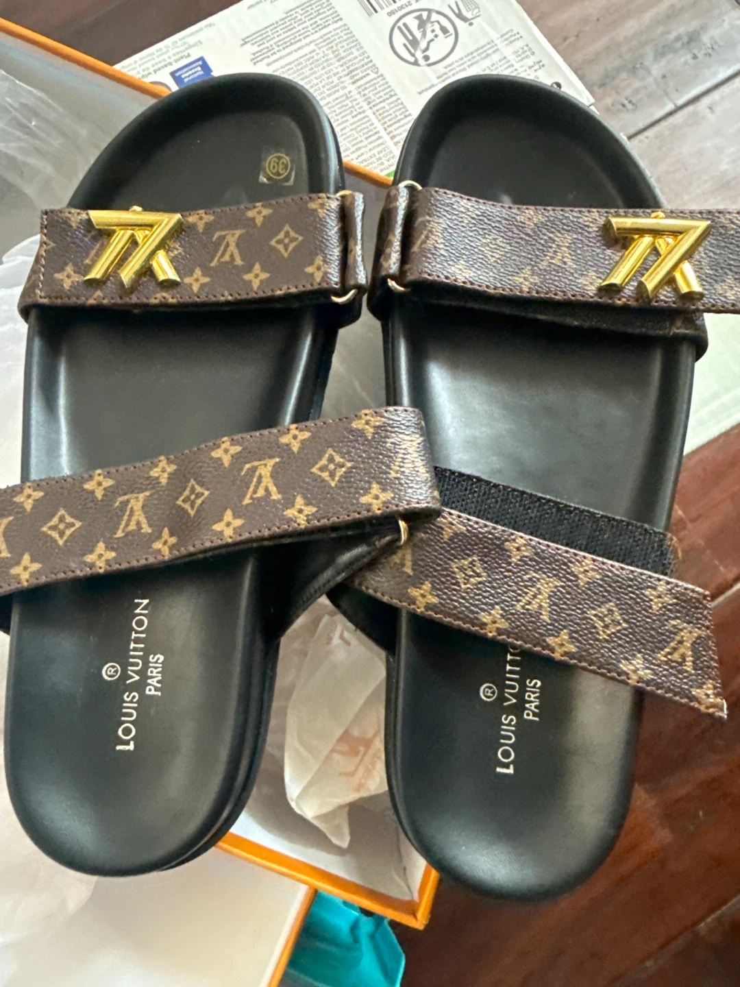 These Louis Vuitton slides feature the iconic monogram pattern on the straps with gold-tone hardware. They're a stylish and comfortable option for everyday wear. Made with quality materials for durability.