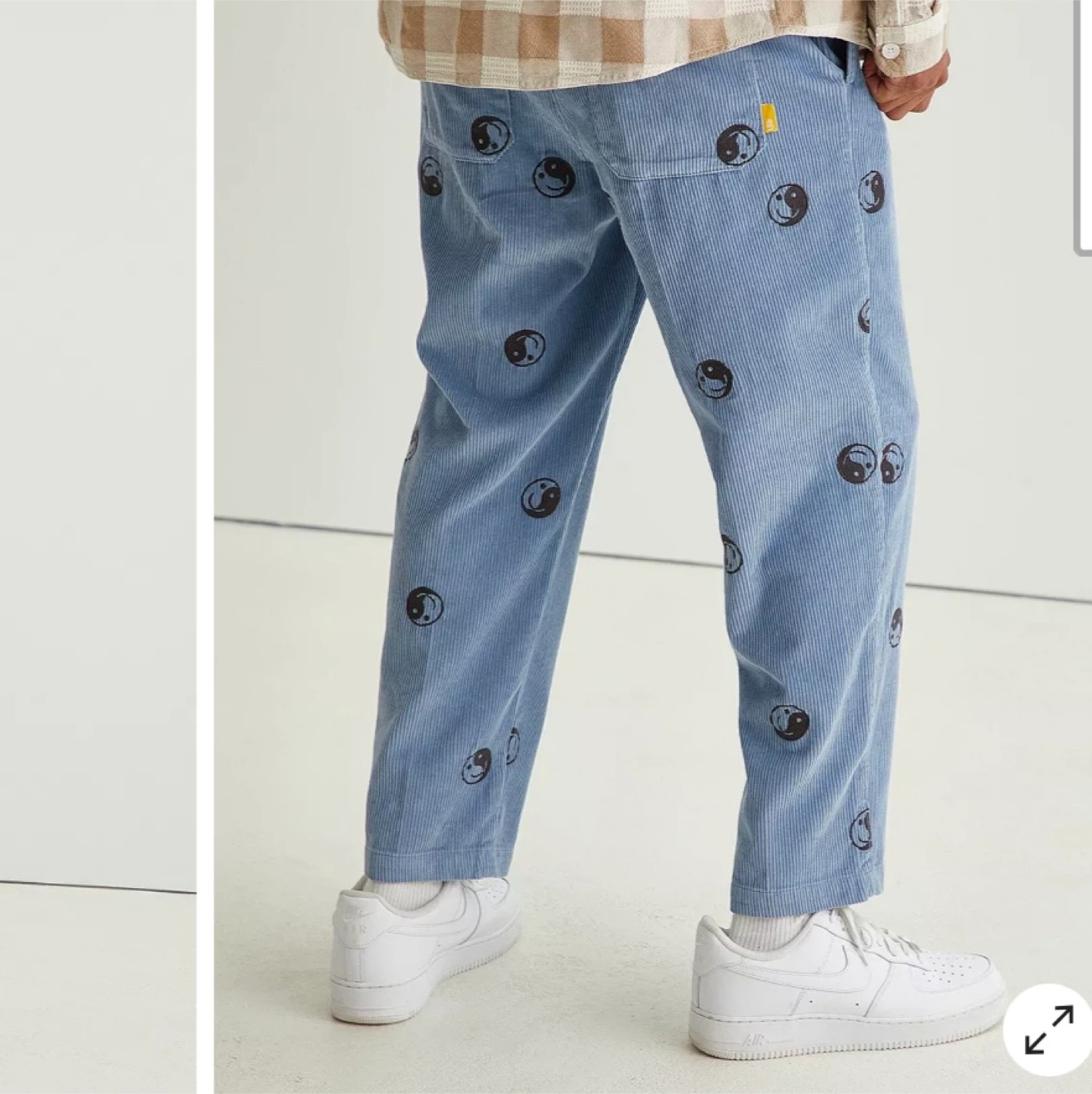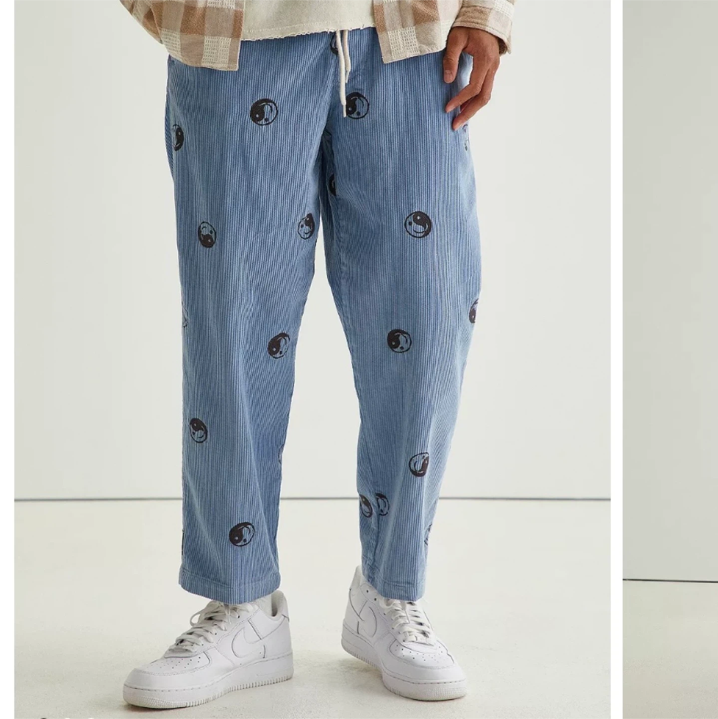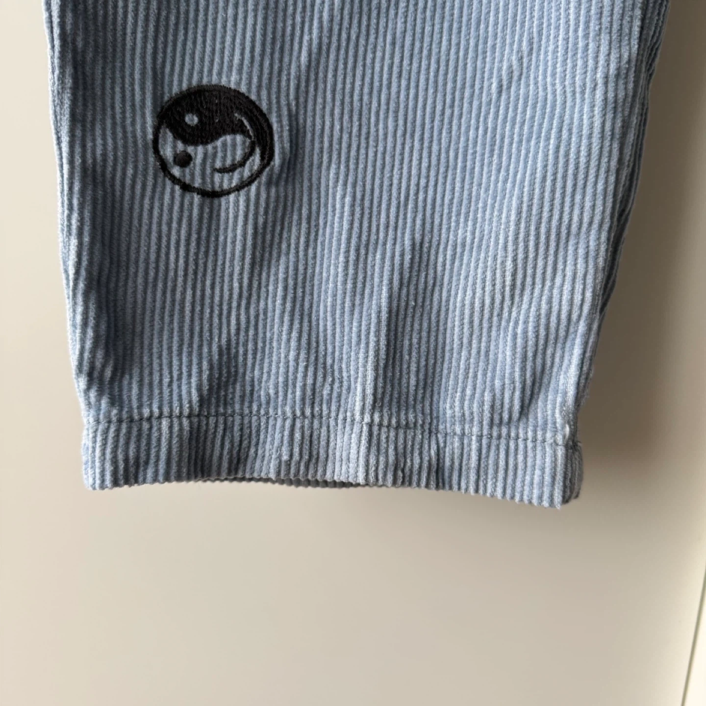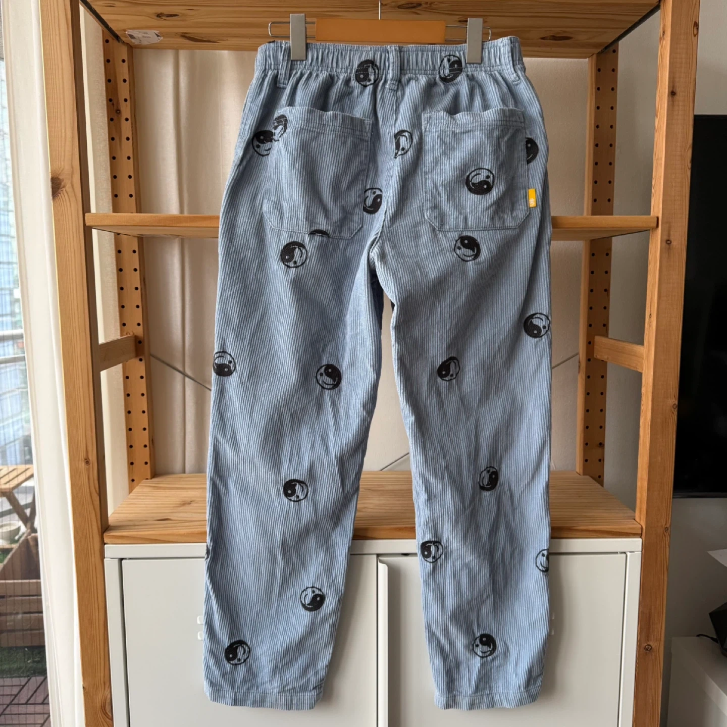 Light blue corduroy pants by Urban Outfitters. Features a pattern of yin and yang symbols. Made in Vietnam.