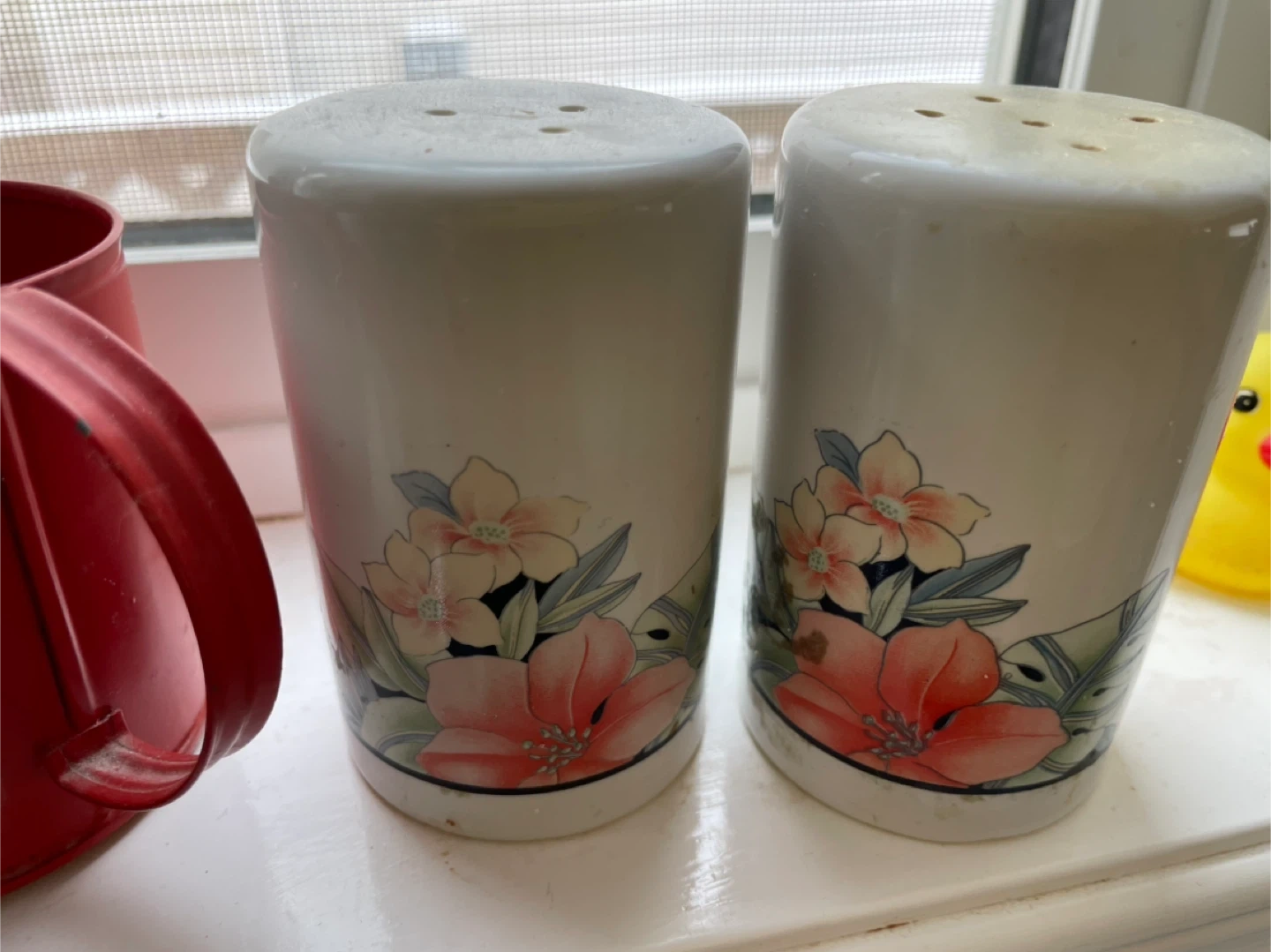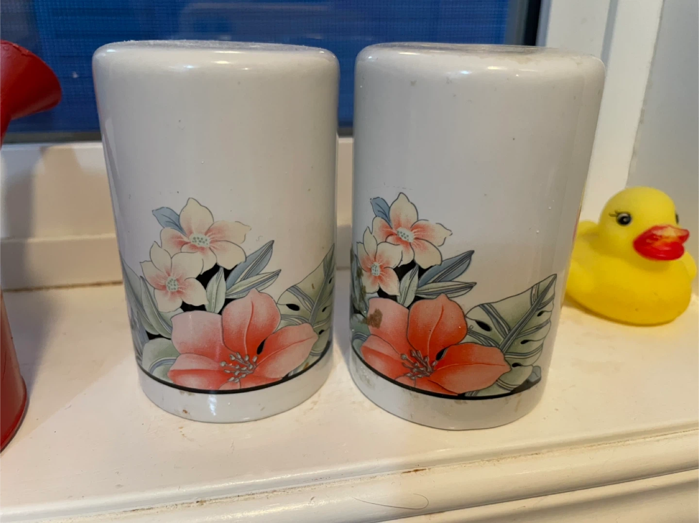 Two vintage-style ceramic salt and pepper shakers. Each shaker features a lovely floral decal with pink and peach blossoms and green leaves. They're perfect for adding a touch of retro charm to your kitchen table.