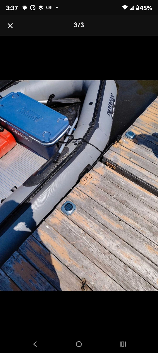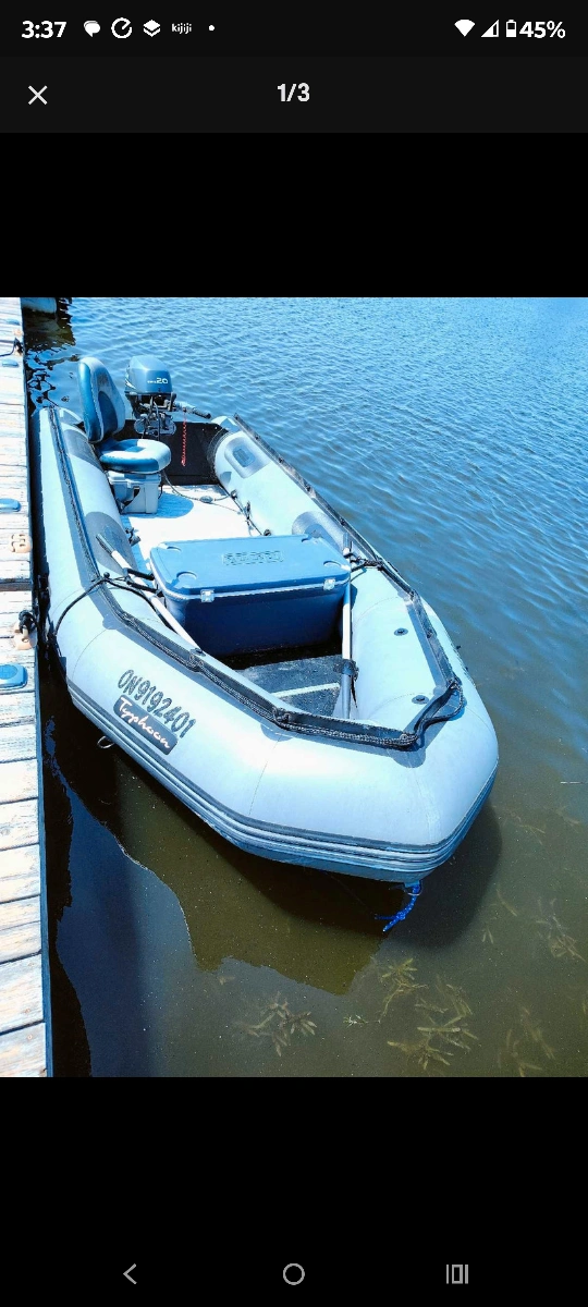 An inflatable dinghy with an outboard motor. Light grey color. The vessel has a cooler and other accessories. A calming ride on the water, what more could you ask for?