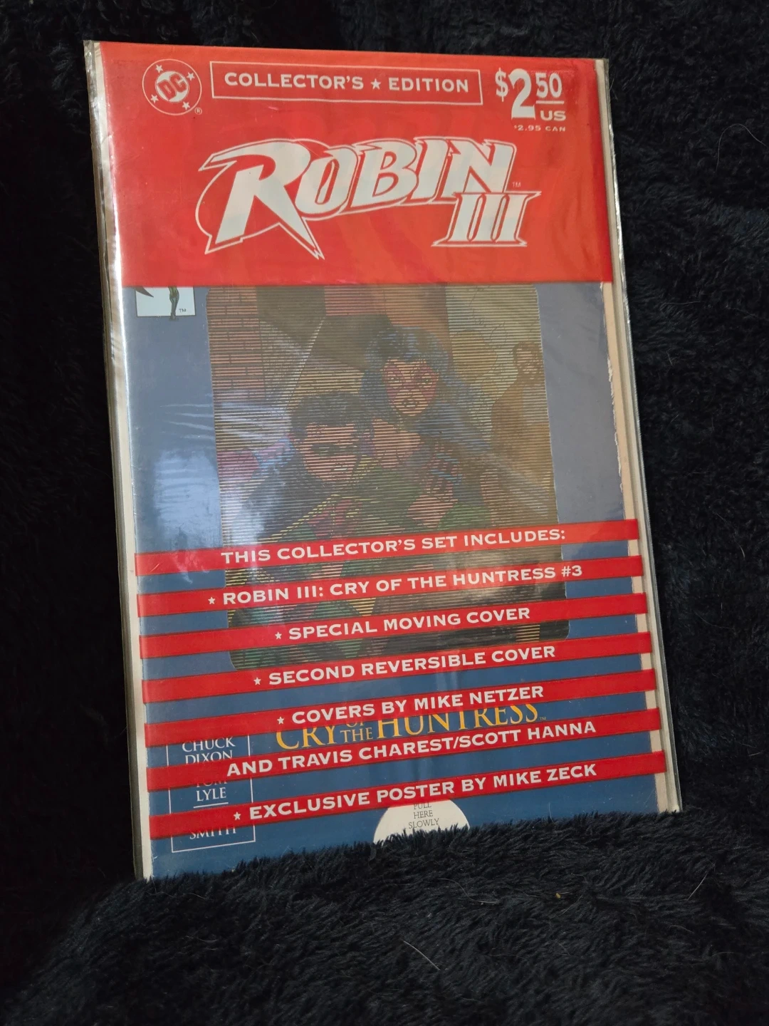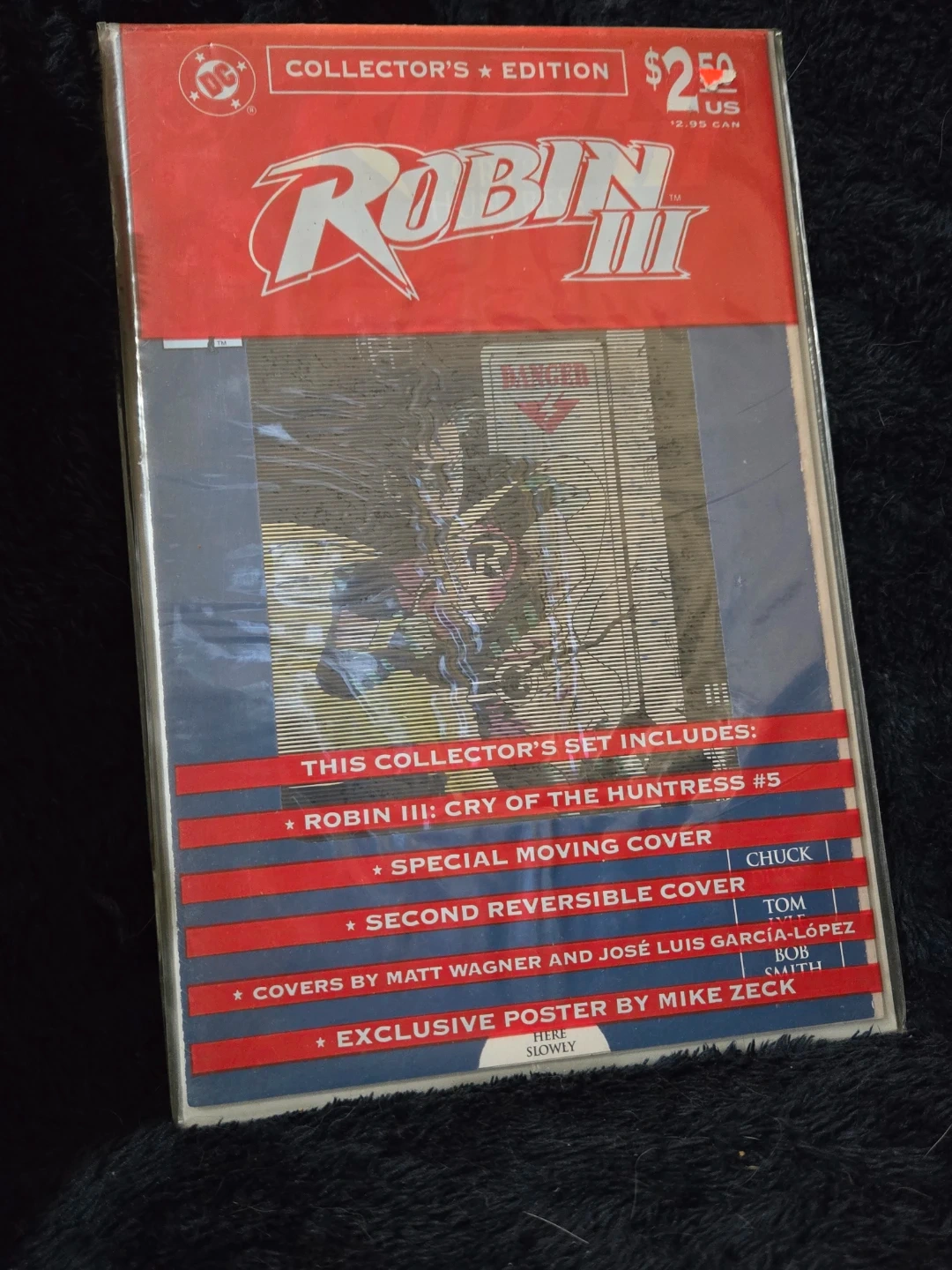 This collector's set includes Robin III: Cry of the Huntress #3, #4 and #5. It also comes with a special moving cover, a second reversible cover, and an exclusive poster by Mike Zeck. The covers are by Chuck Dixon, Tom Lyle, Michael Golden, Brian Stelfreeze, Matt Wagner, and Jose Luis Garcia-Lopez.