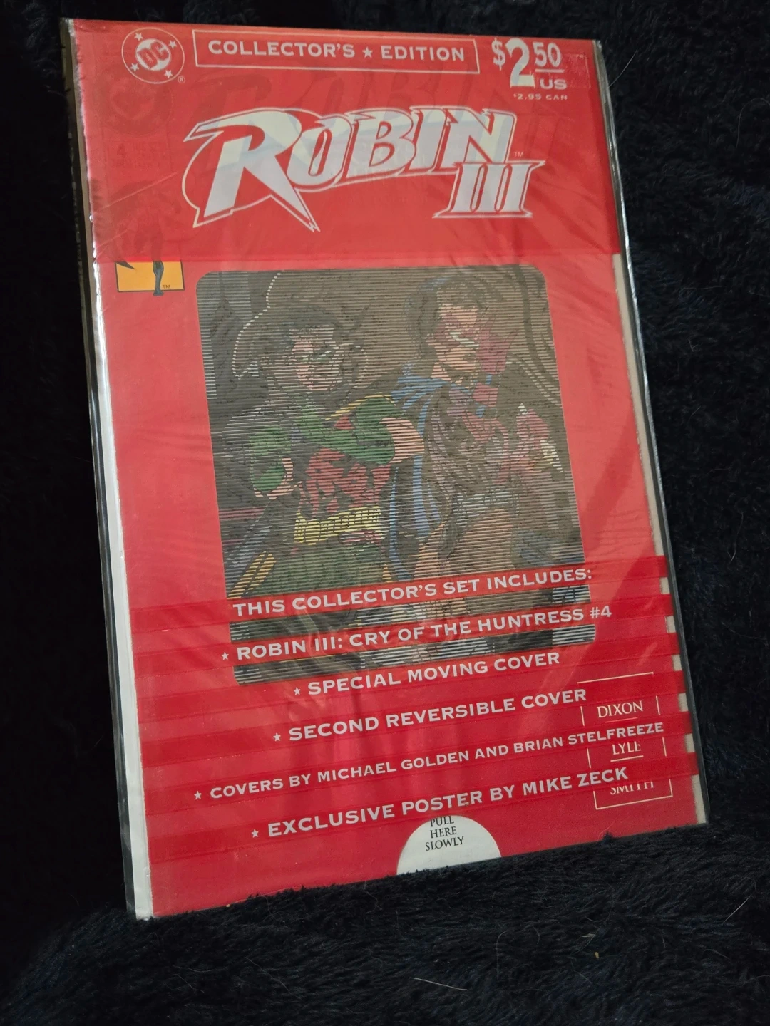 This collector's set includes Robin III: Cry of the Huntress #3, #4 and #5. It also comes with a special moving cover, a second reversible cover, and an exclusive poster by Mike Zeck. The covers are by Chuck Dixon, Tom Lyle, Michael Golden, Brian Stelfreeze, Matt Wagner, and Jose Luis Garcia-Lopez.