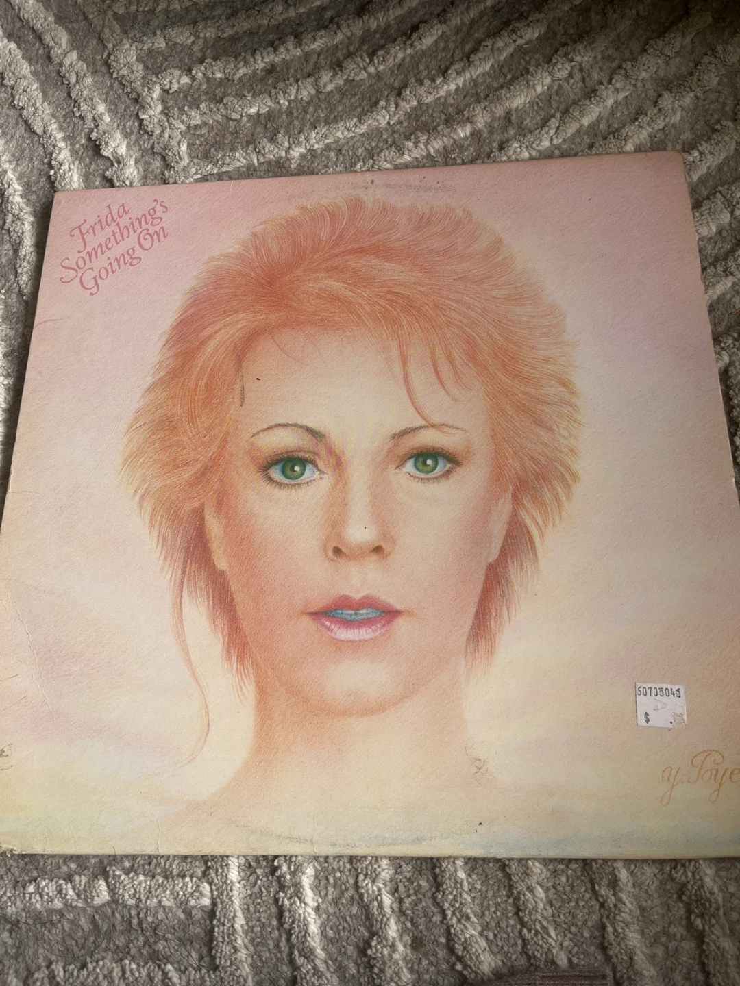 This is Frida's 1982 album, 'Something's Going On.' It's a vinyl record. The cover art is a coloured pencil drawing of Frida.