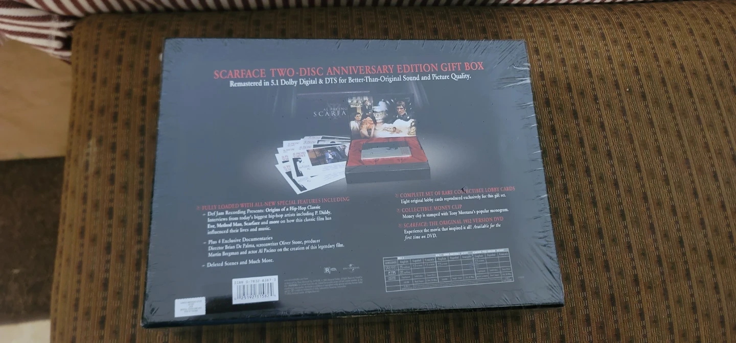 164Selling a Scarface Two-Disc Anniversary Edition Gift Box! It's still sealed in its original packaging. This set is remastered in 5.1 Dolby Digital & DTS for better-than-original sound and picture quality. It includes: - Play Loaded With All-New Special Features Including Def Jam Recording Presents: Origins of a Hip-Hop Classic - Complete Set of Rare Scarface Picture Lobby Cards - Collectible Money Clip - Scarface The Original 1932 Version DVD