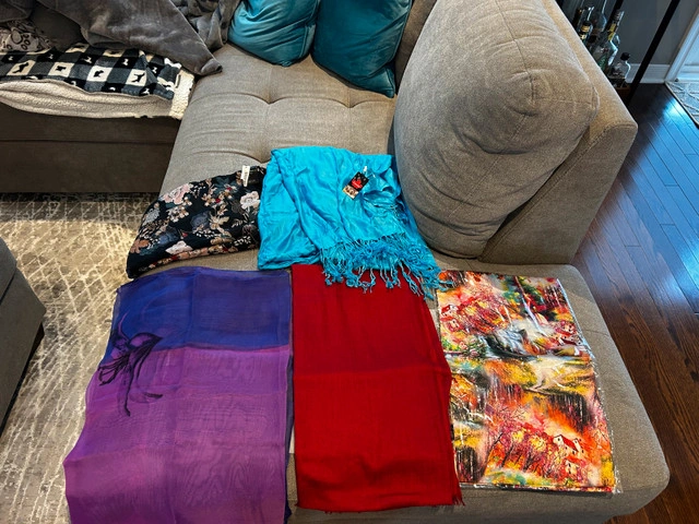 1635 NEW SCARVES all for $50 that’s $10 per scarf Accessorize your wardrobe with this array of vibrant scarves! New with tags still on, these scarves come in a variety of patterns and colours. Perfect to spice up any outfit. Don't miss out on this fantastic deal! If the ad's still up the scarves are still available!