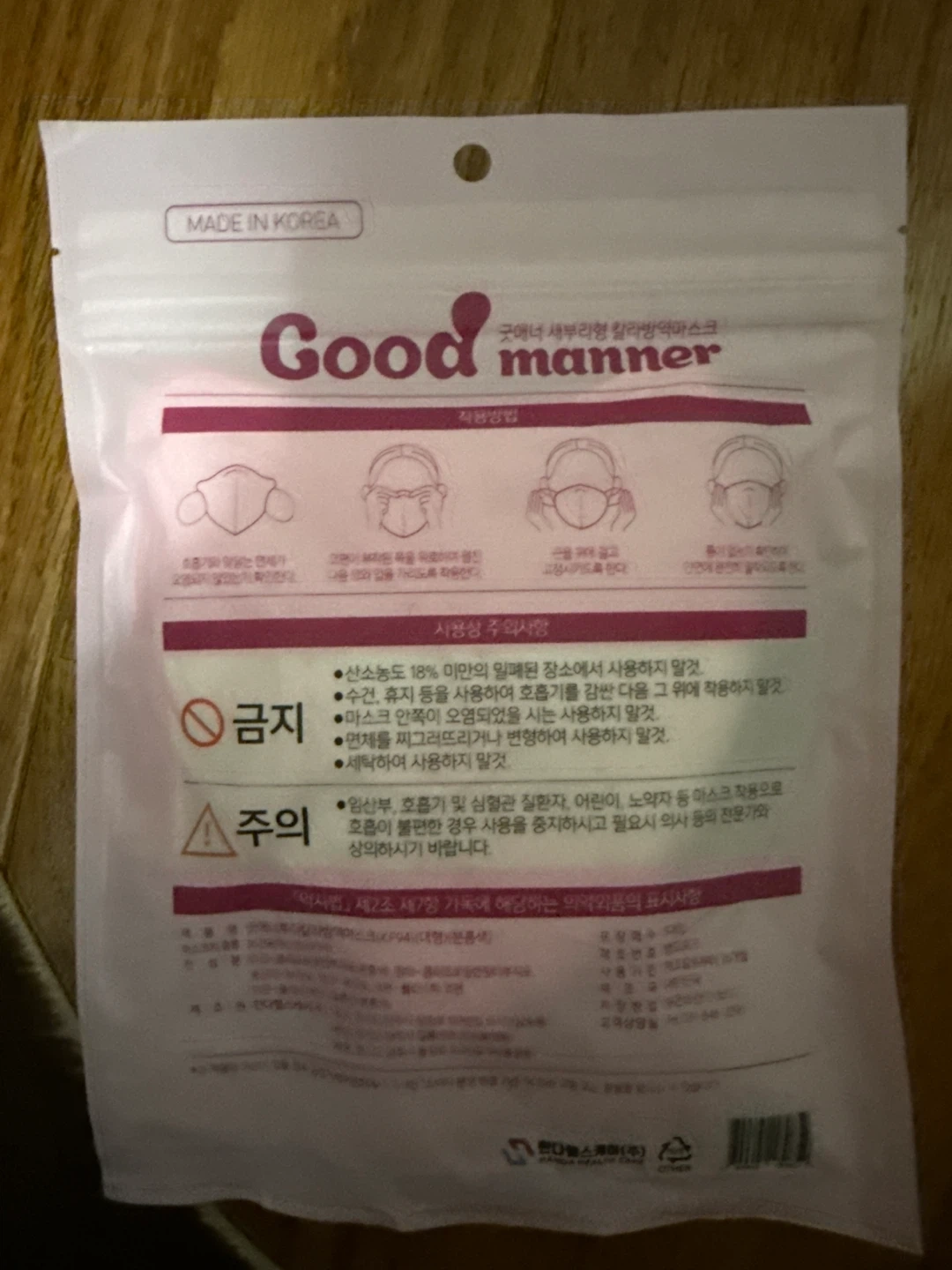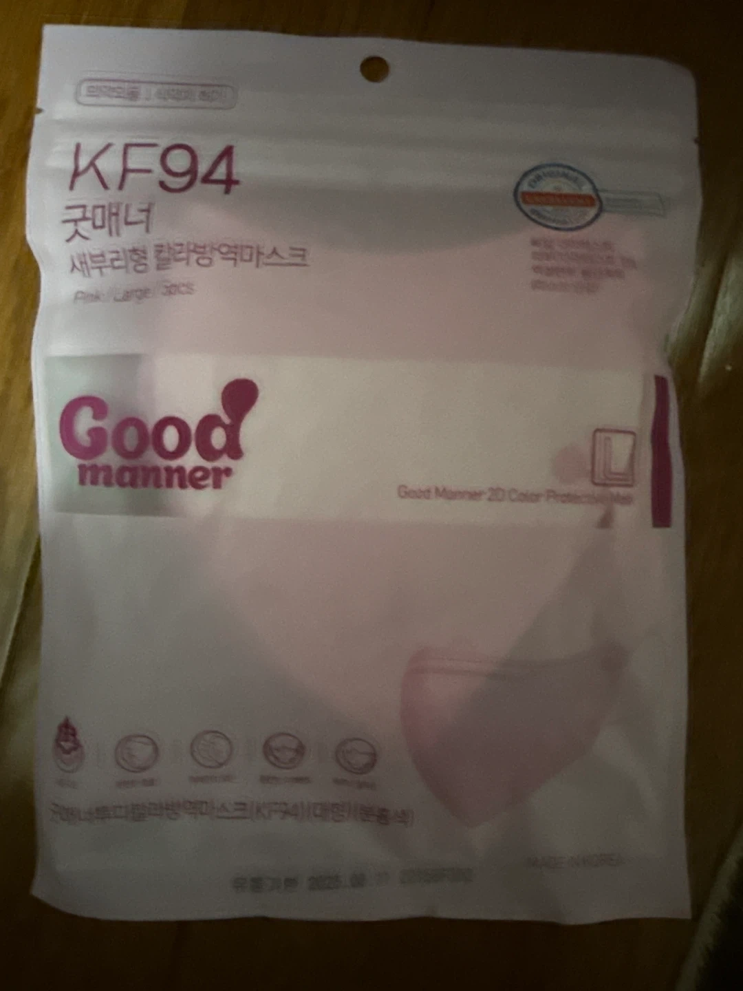 Good Manner KF94 masks in a large pink colour. These masks are made in Korea. Includes 5 masks per bag