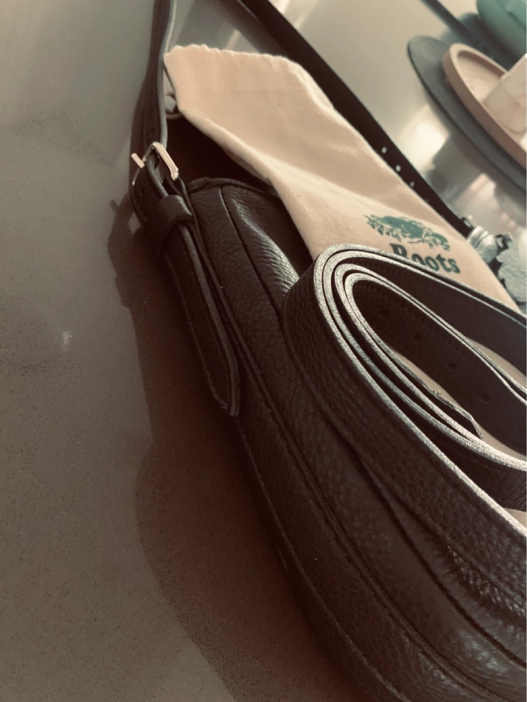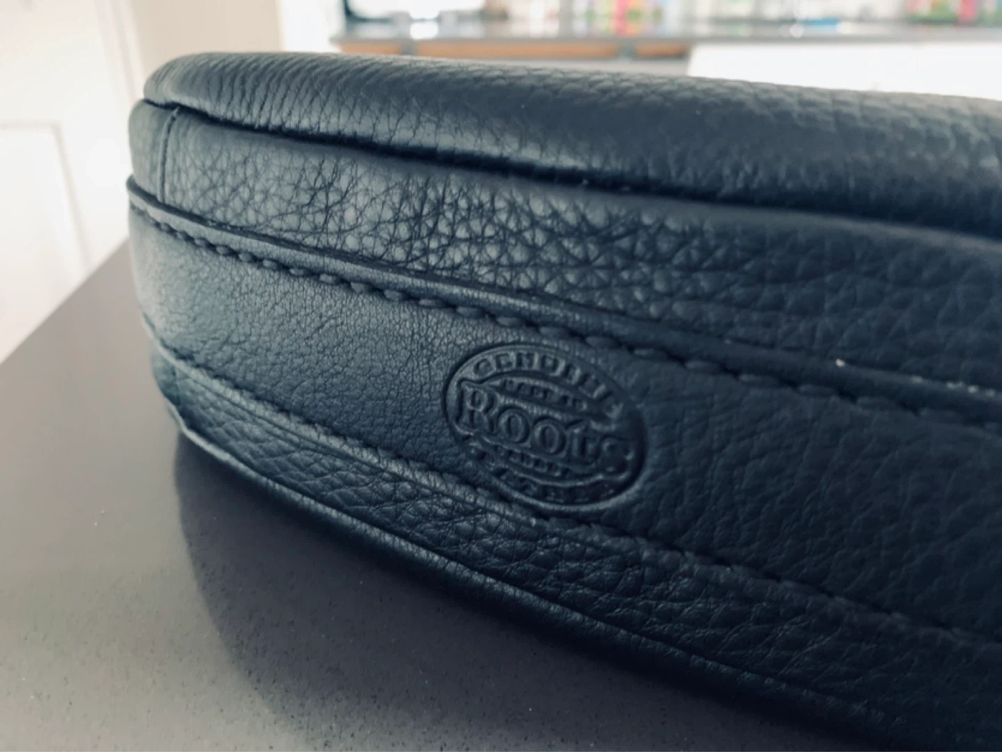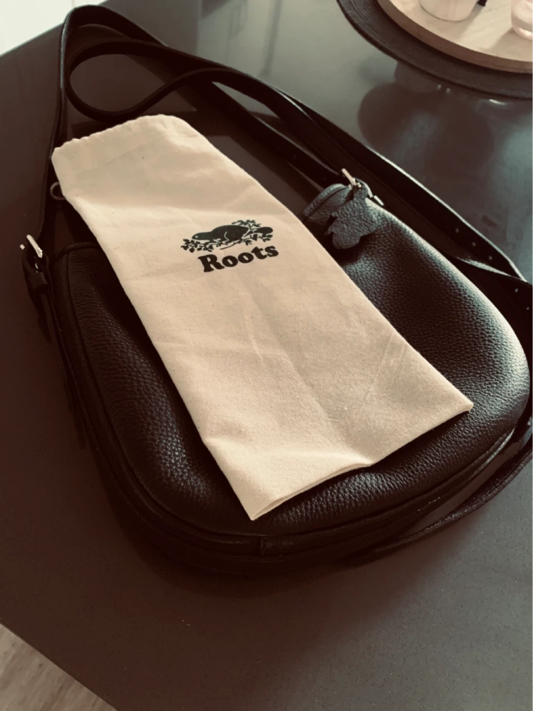 ROOTS black leather shoulder or crossbody bag. It comes with a protective dust bag & two leather straps. Canadian made genuine leather.