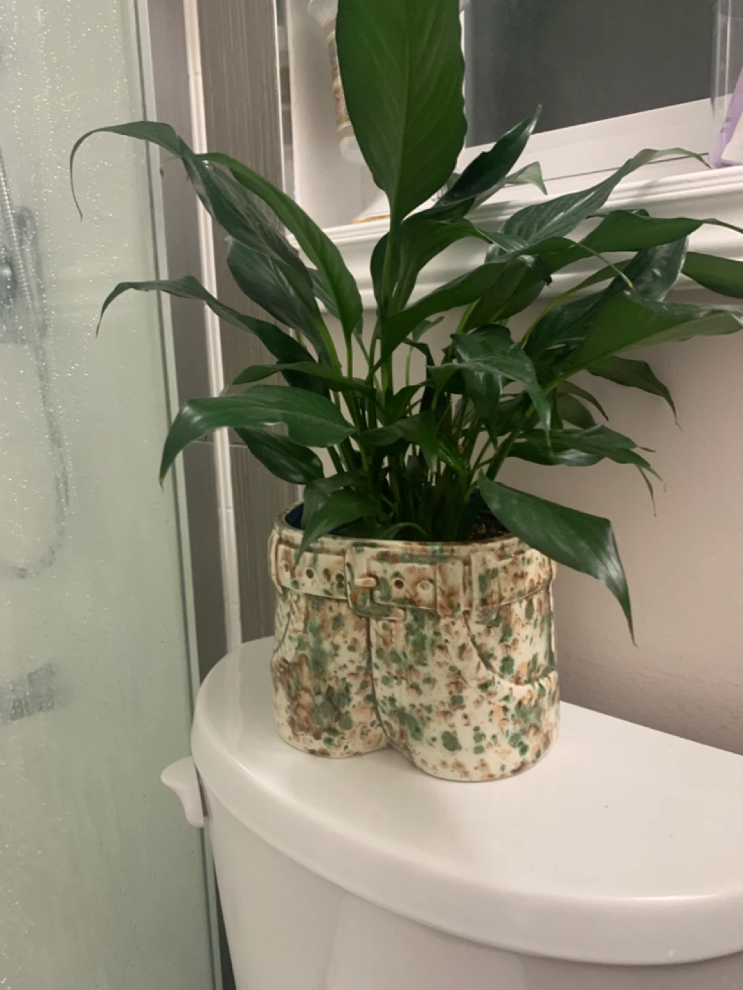 This is a healthy Peace Lily plant in a fun, novelty pot shaped like a pair of jeans. It's a real conversation starter for any room!