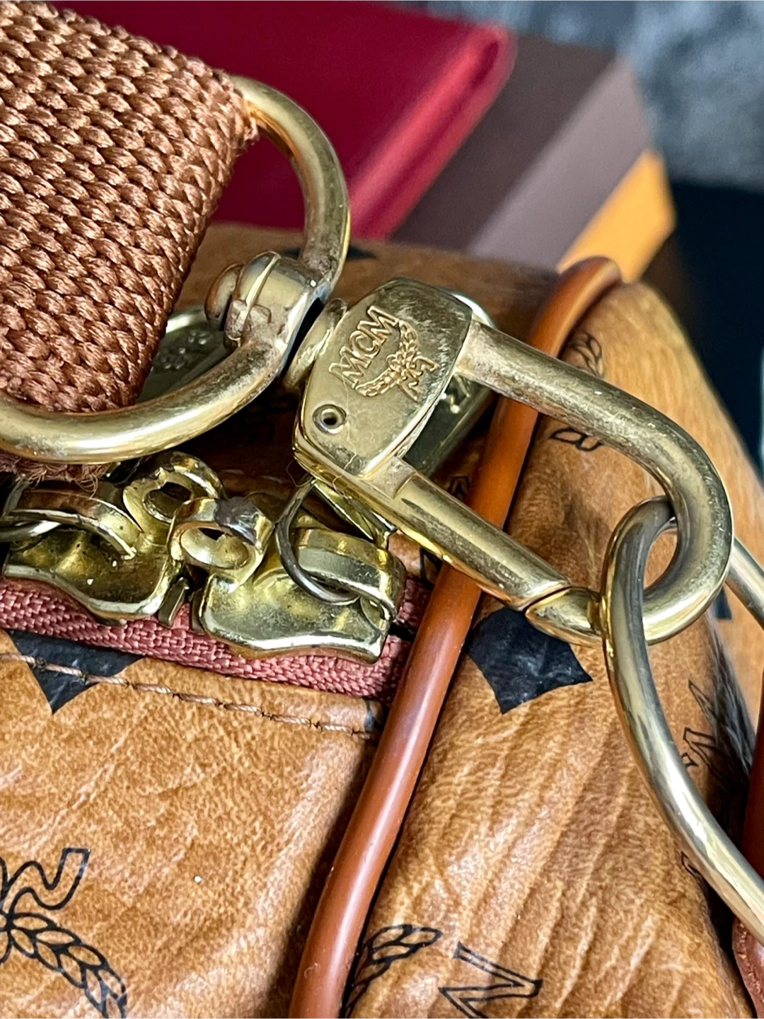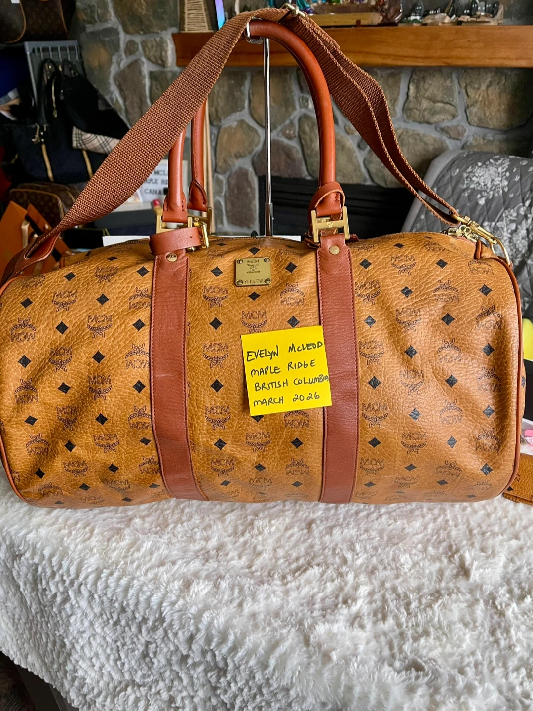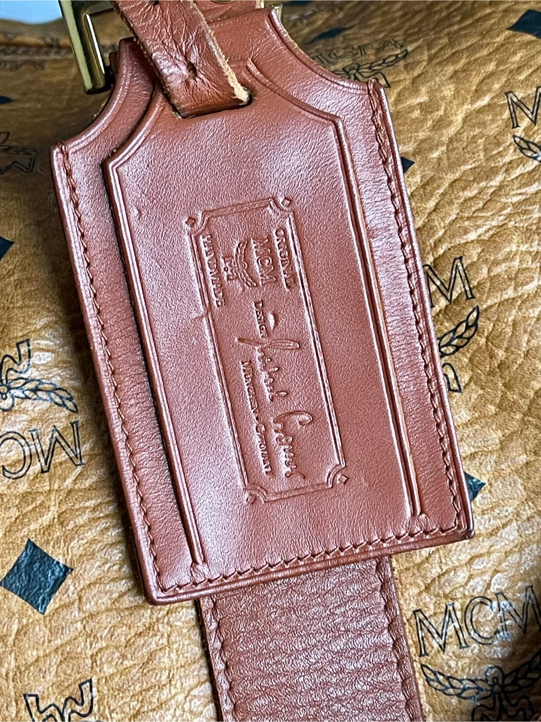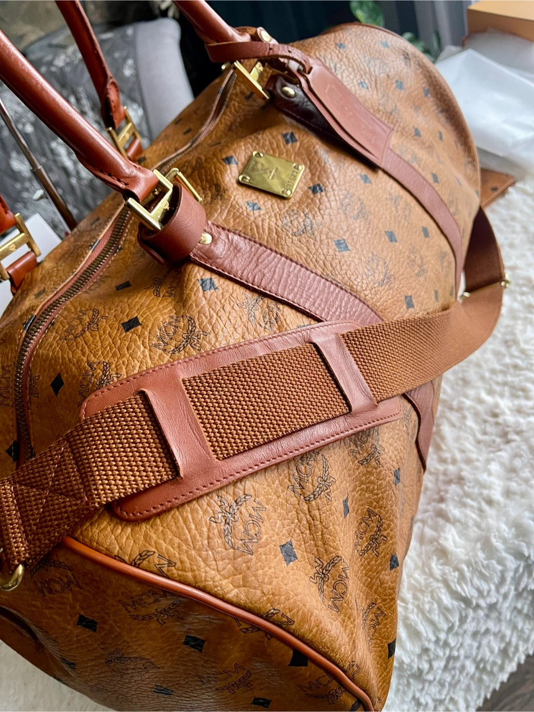 This MCM weekender bag features the signature monogram print. It has sturdy leather handles and an adjustable shoulder strap. This is a spacious bag for travel!