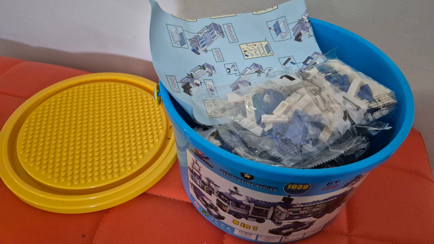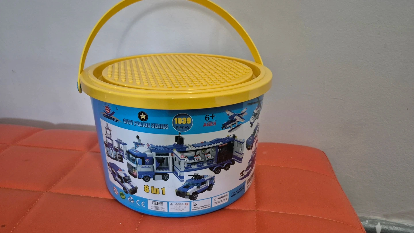 This is a building block police car set with 1039 pieces and is recommended for ages 6+. It's an 8-in-1 set, meaning you can build multiple different police vehicles. It comes in a handy bucket for storage.