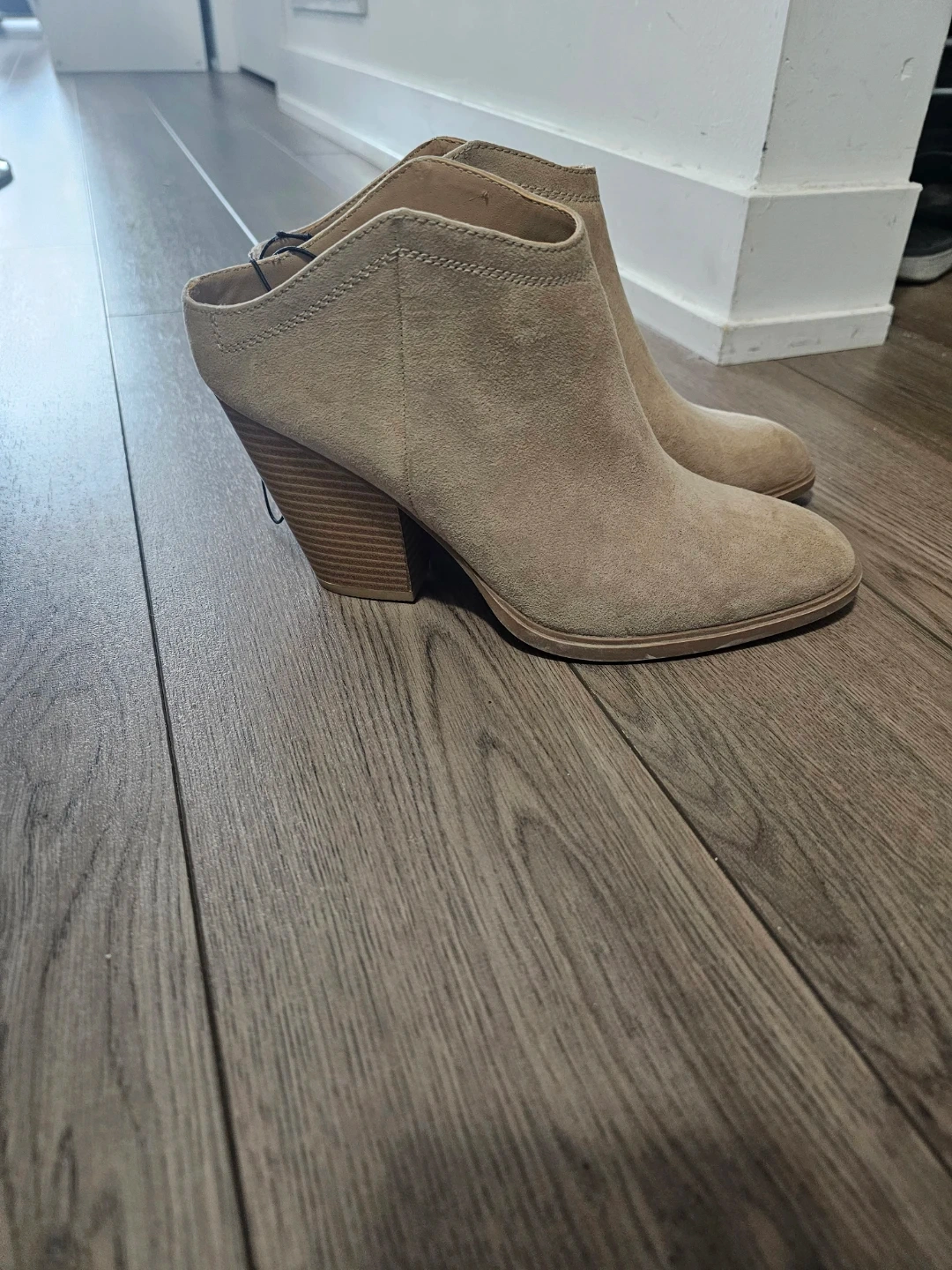 These tan suede heeled ankle boots offer a stylish look with a comfortable fit. They feature a side cut-out design and a stacked wooden heel. Perfect for dressing up or down!