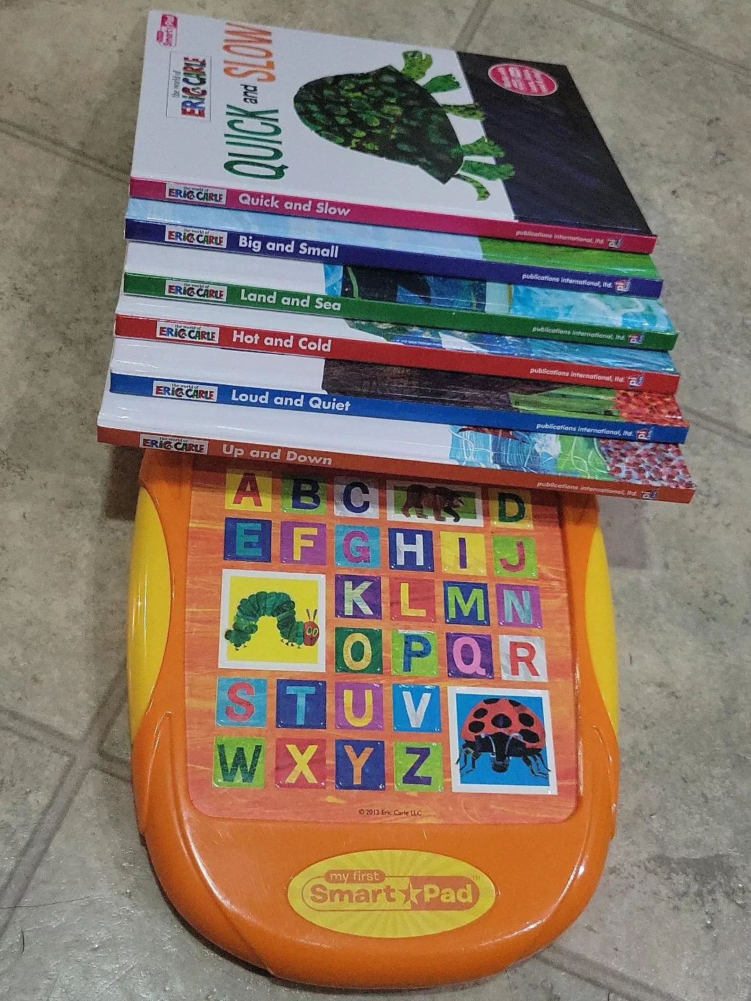 This lot includes the Eric Carle My First Smart Pad and six board books. Books are titled Quick and Slow, Big and Small, Land and Sea, Hot and Cold, Loud and Quiet, and Up and Down. The Smart Pad displays the alphabet and features the Very Hungry Caterpillar.