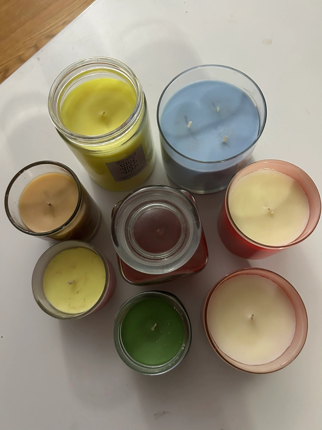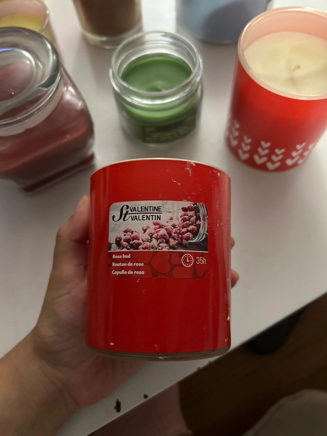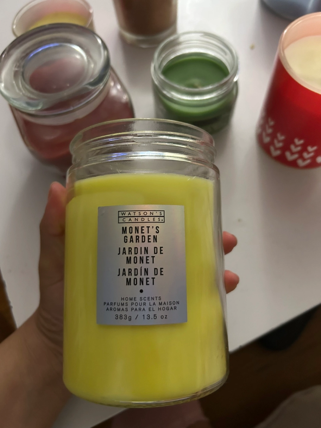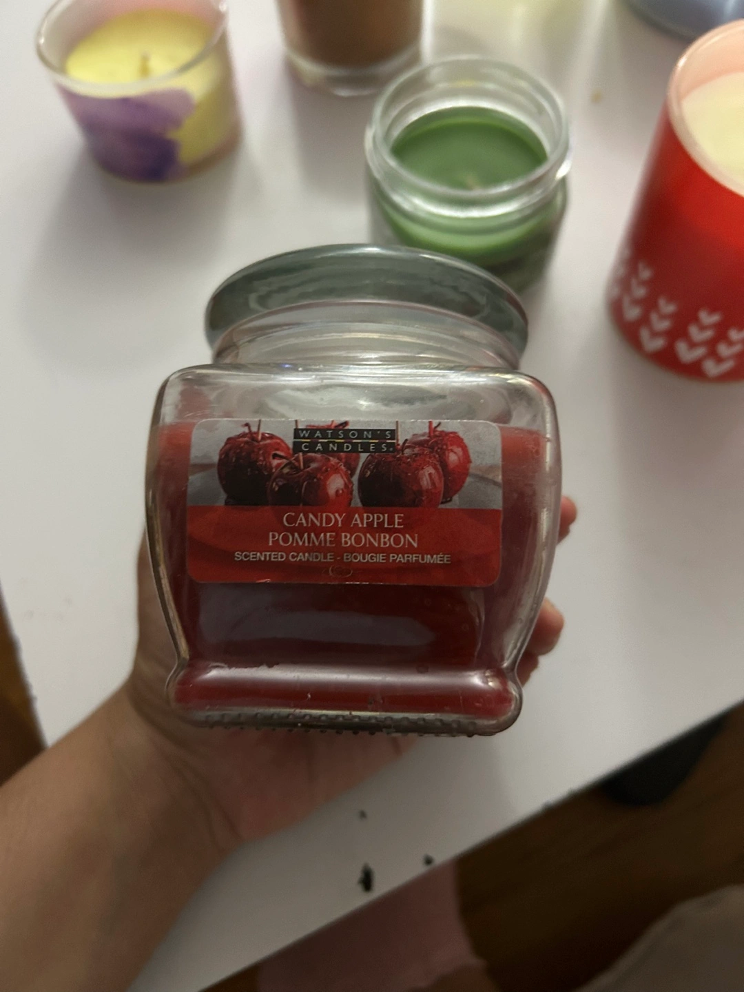 15There are 4 newly candles, 2 used but new, and 2 candles are used but in a good condition. Newly candles: Watson’s PetitGrain Basil (green), Watson’s Candy Apple (red), Watson’s Might Frost (light blue), Watson’s Monet’s Garden (bright yellow) 2 used but new candles: Valentine Rose bud (white) x2 2 used but good condition: Spicy Apple Crumble (light brown) and the second is unknown (pastel yellow) Perfect for creating a cozy atmosphere! 🕯️ Cash only!