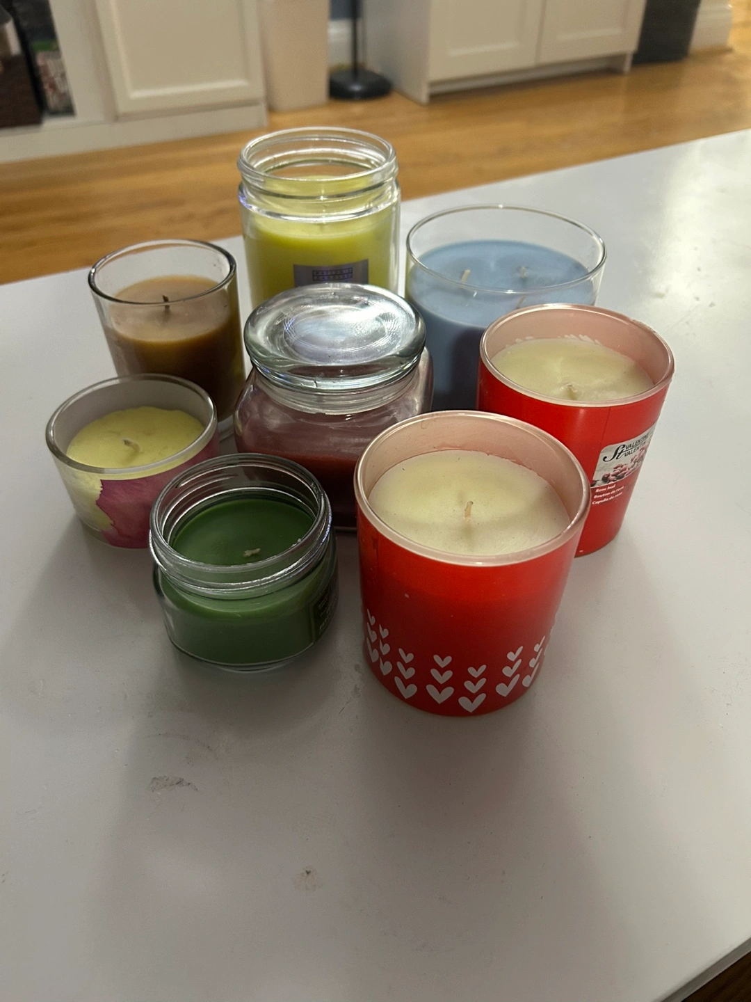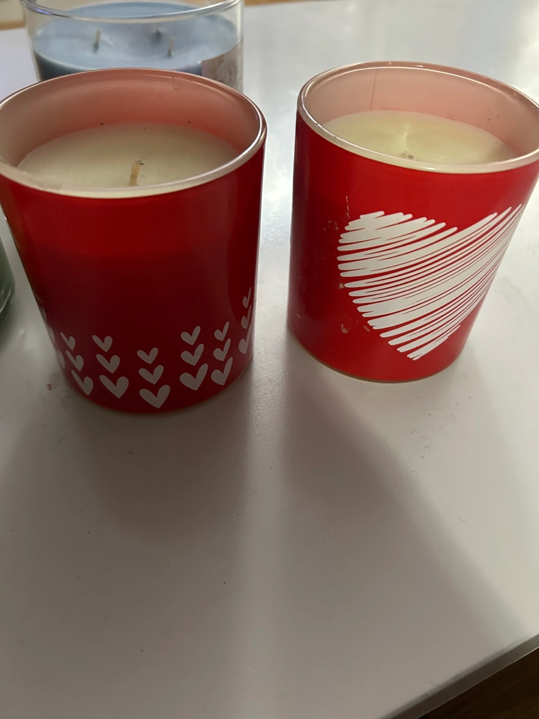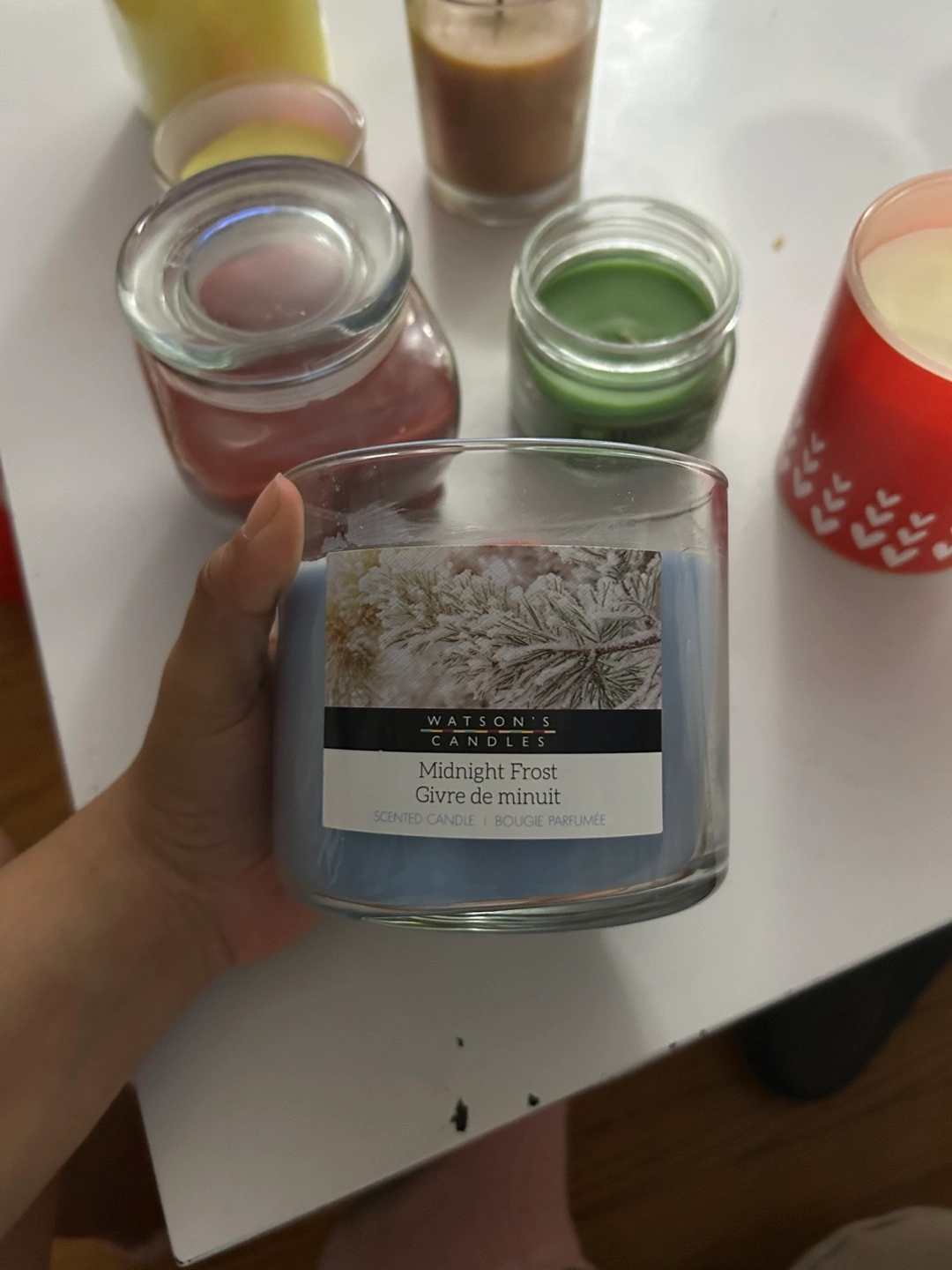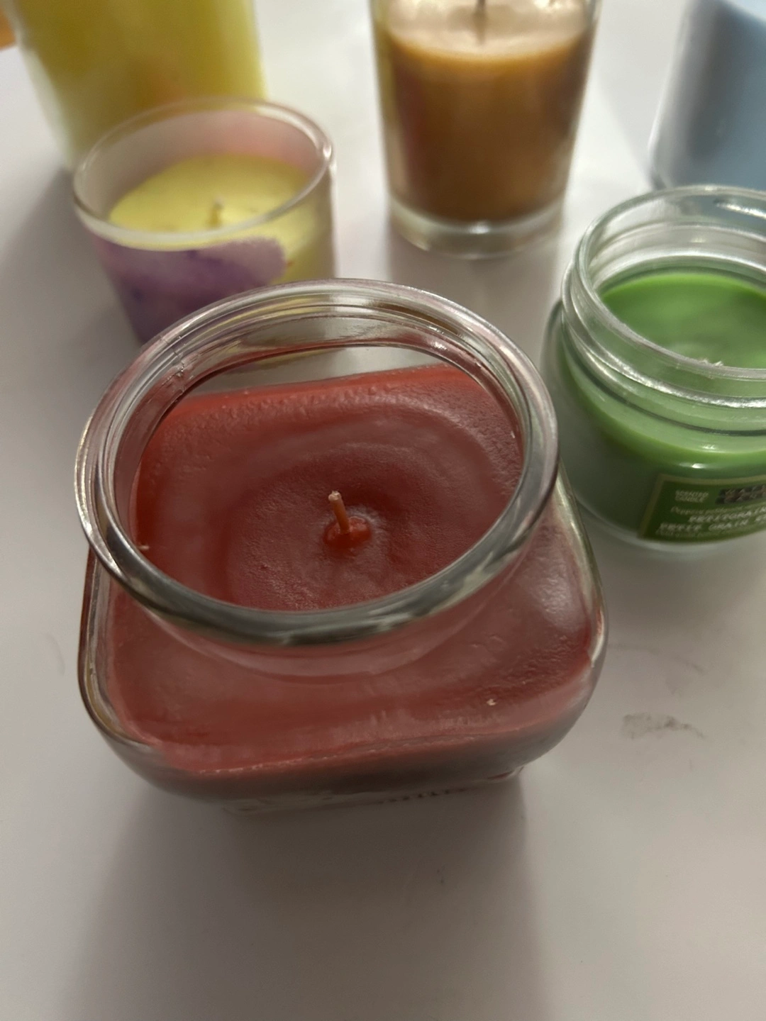15There are 4 newly candles, 2 used but new, and 2 candles are used but in a good condition. Newly candles: Watson’s PetitGrain Basil (green), Watson’s Candy Apple (red), Watson’s Might Frost (light blue), Watson’s Monet’s Garden (bright yellow) 2 used but new candles: Valentine Rose bud (white) x2 2 used but good condition: Spicy Apple Crumble (light brown) and the second is unknown (pastel yellow) Perfect for creating a cozy atmosphere! 🕯️ Cash only!