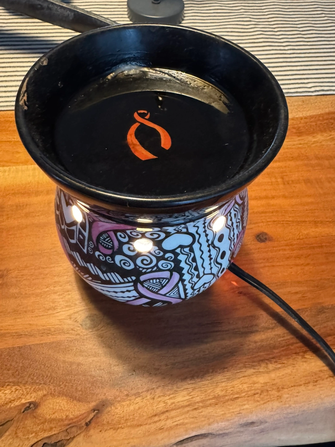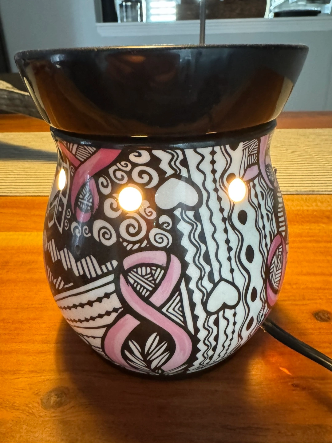 109Scentsy warmer with pink ribbon (breast cancer) design. Includes one Scentsy Cinnamon Vanilla Delight brick wax.