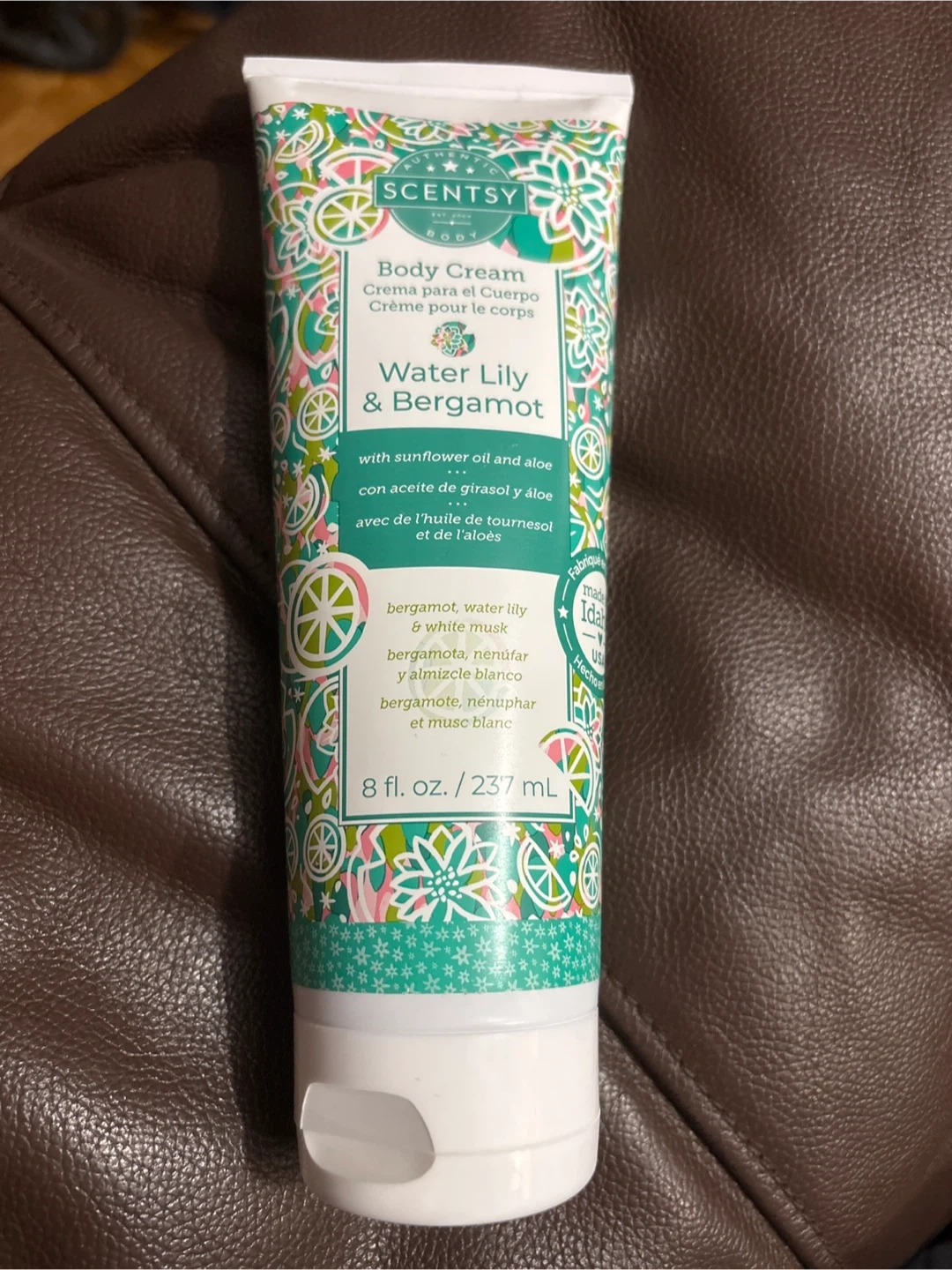 10Selling a tube of Scentsy Body Cream in the Water Lily & Bergamot scent! It contains sunflower oil and aloe. The tube contains 8 fl oz / 237 mL of product. A lovely scent for everyday use! Description: Bergamot and white musk relax next to pools of blooming water lily.