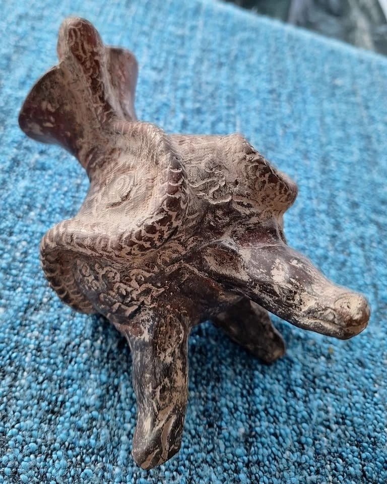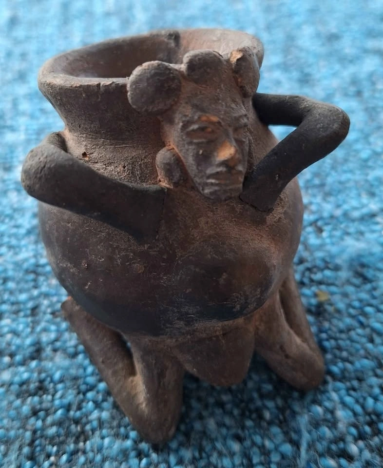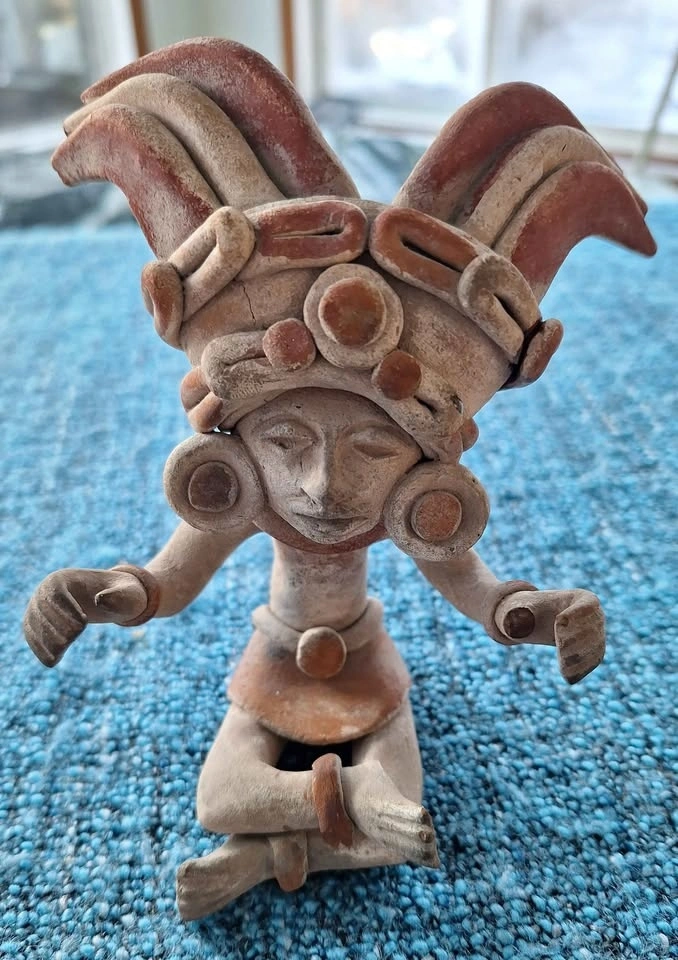 Unique set of 4 ceramic art pieces with an ancient, possibly pre-Columbian inspired style. Includes a vessel with a snake, a small pot with a face and arms (missing feet), a sitting figure with an elaborate headdress (1 broken thumb), and a tall carved statue. Made of clay. Great for home decor.