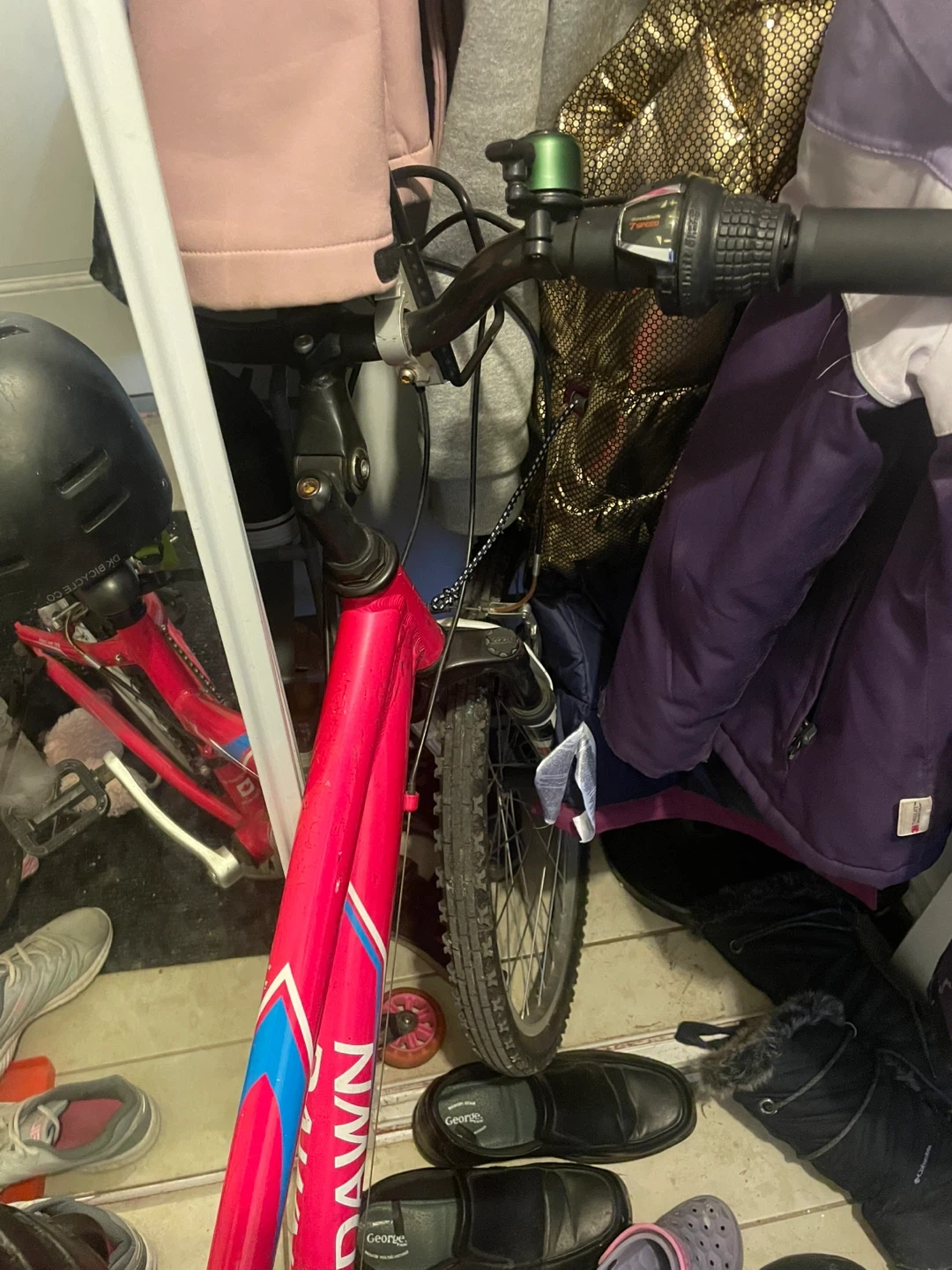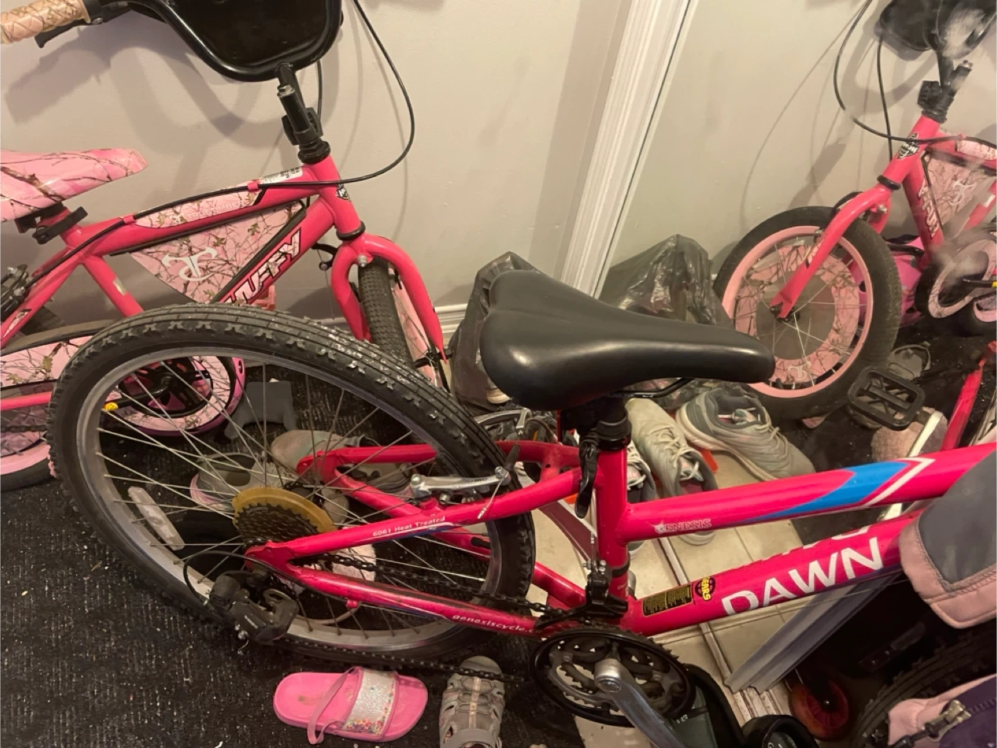 This is a pink DAWN kids bicycle with a camouflage seat. It has multiple gears and is ready for adventures! Perfect for learning to ride or cruising around the neighbourhood.