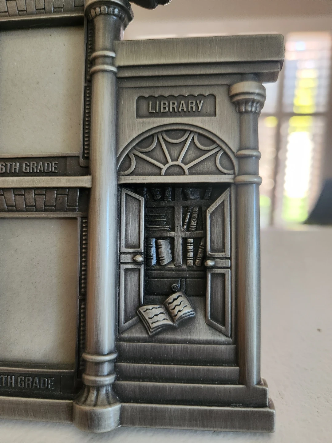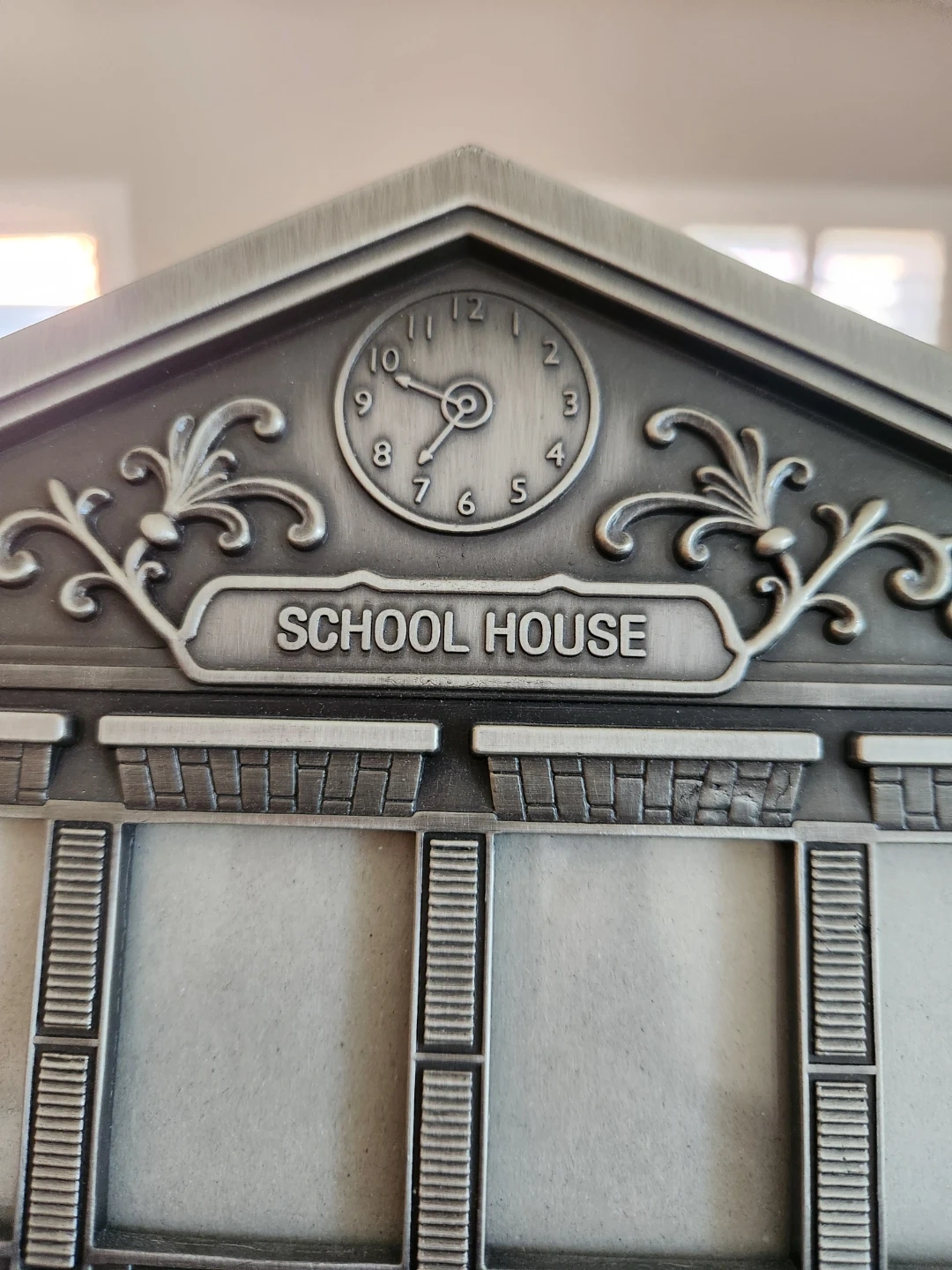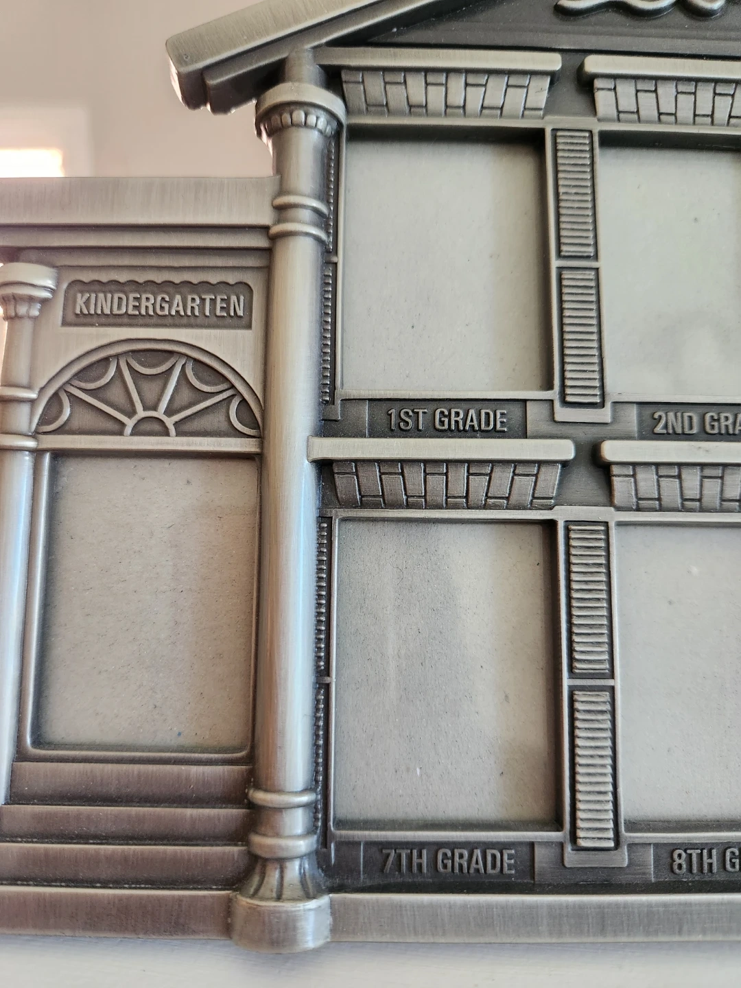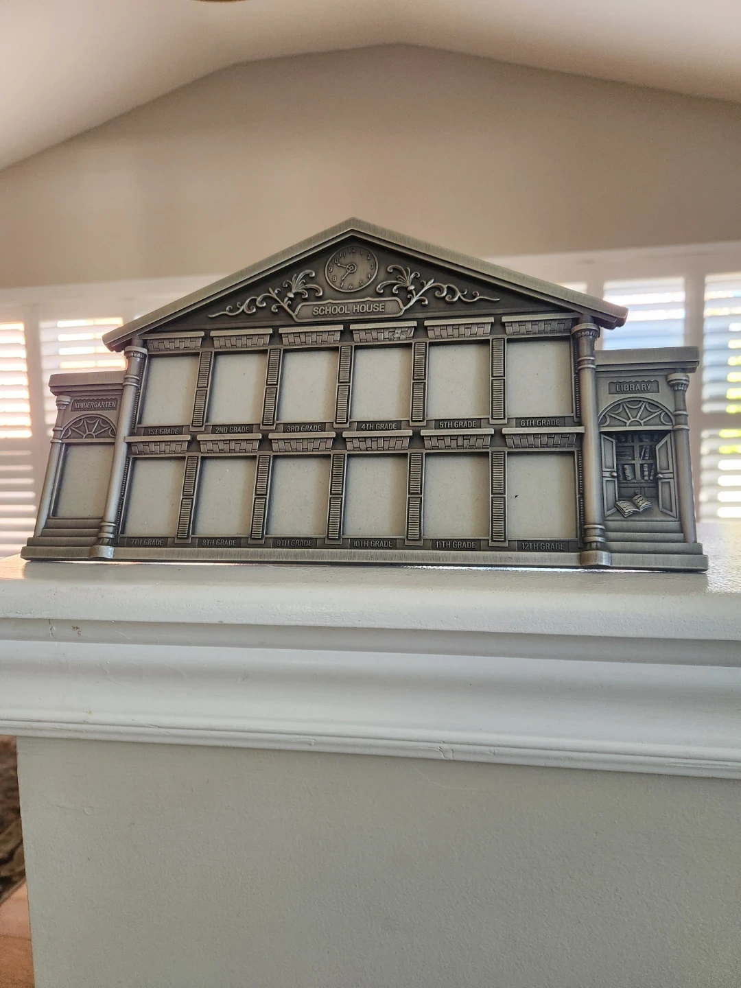 42Capture memories of your little one from kindergarten to grade 12 with this unique keepsake frame! 14 in x 8 in, brand new never used Can be displayed on a shelf or hung on the wall Made to hold wallet sized photos 1.5 x 2 inches
