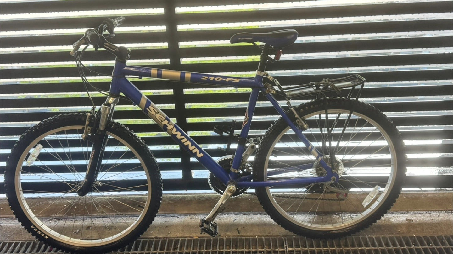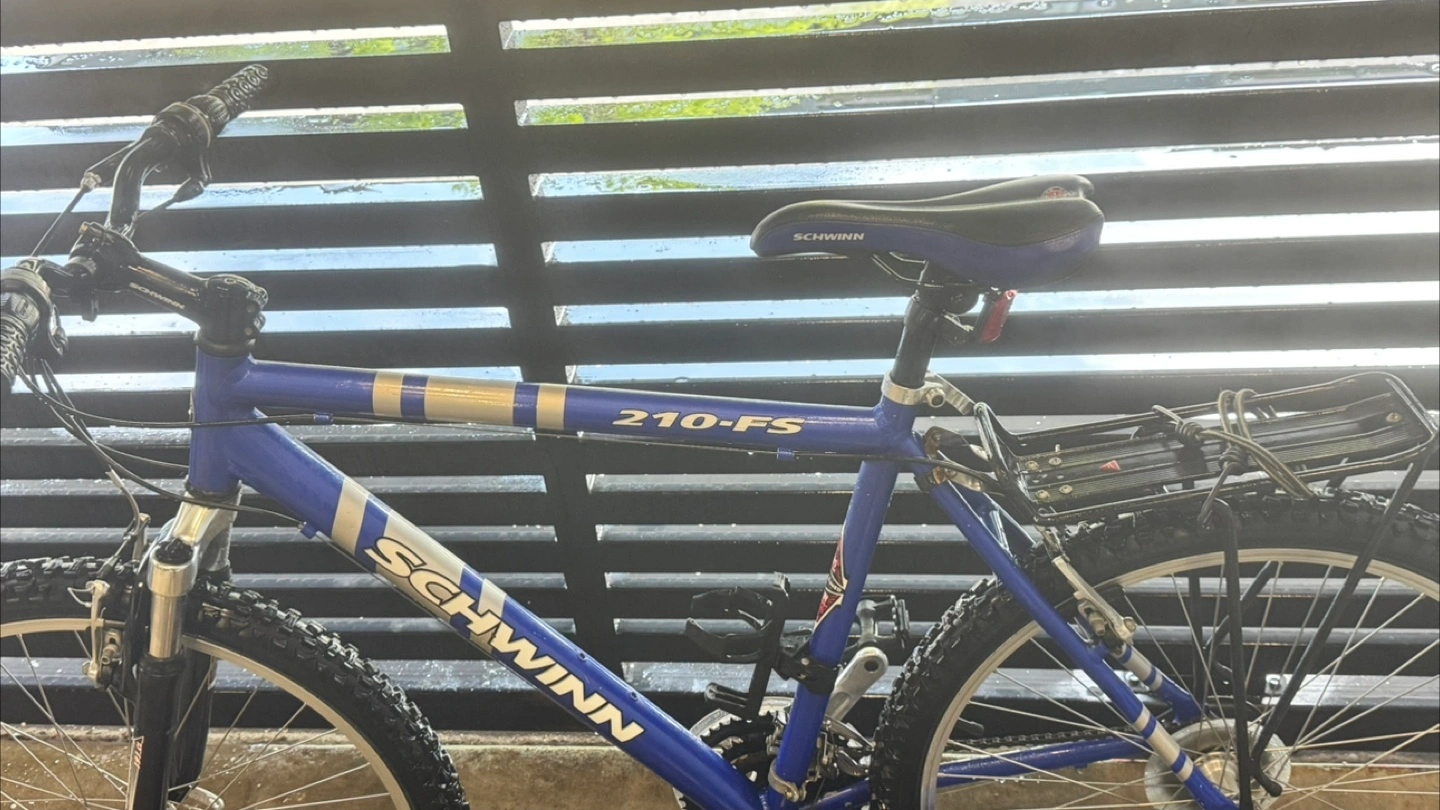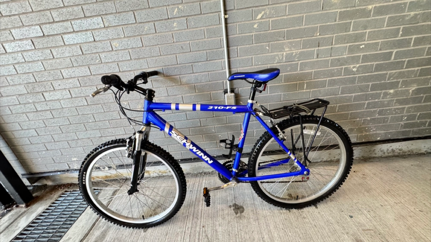 Schwinn 210-FS mountain bike. Blue frame. Front suspension forks. Rear rack. Good condition.