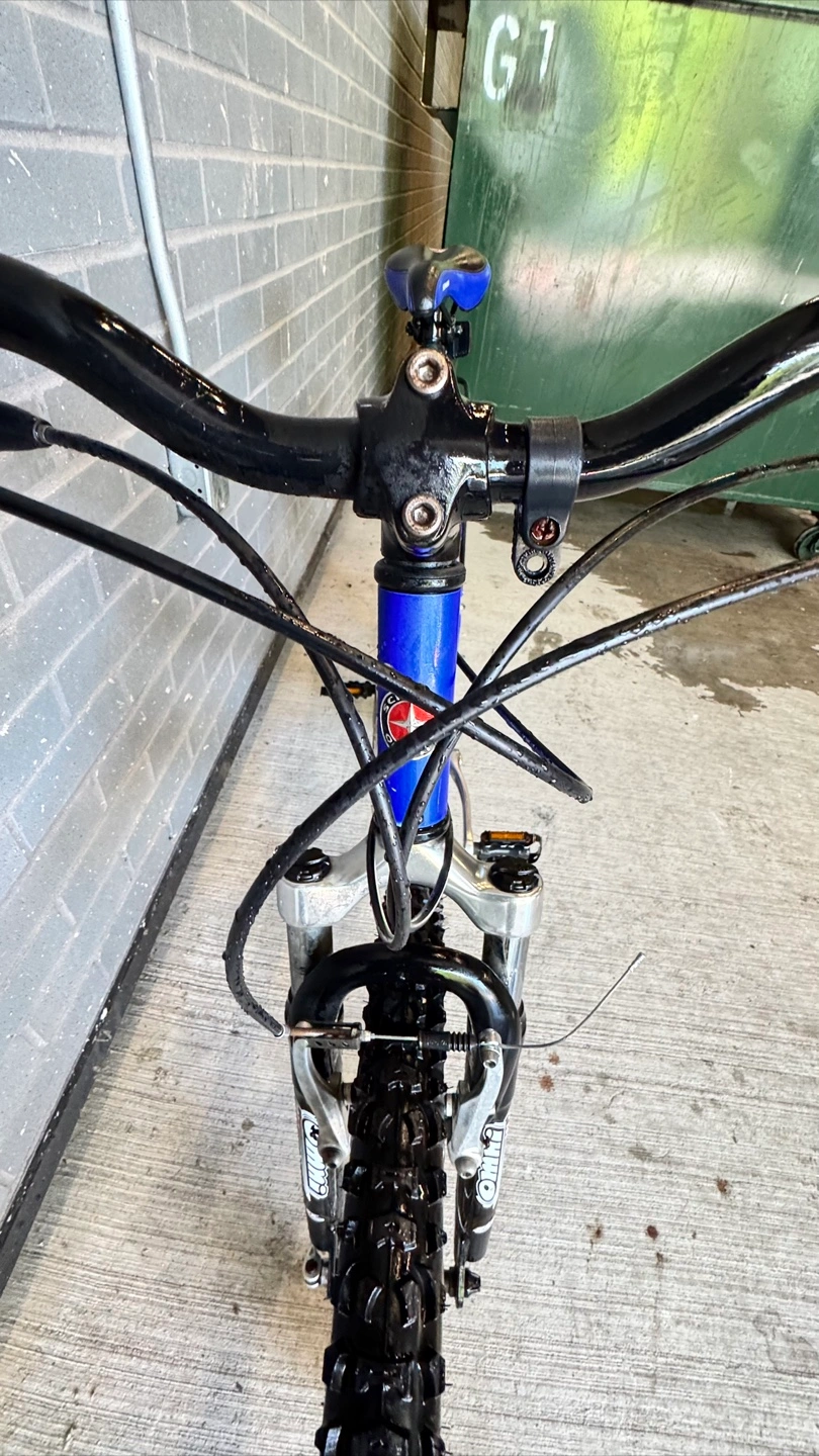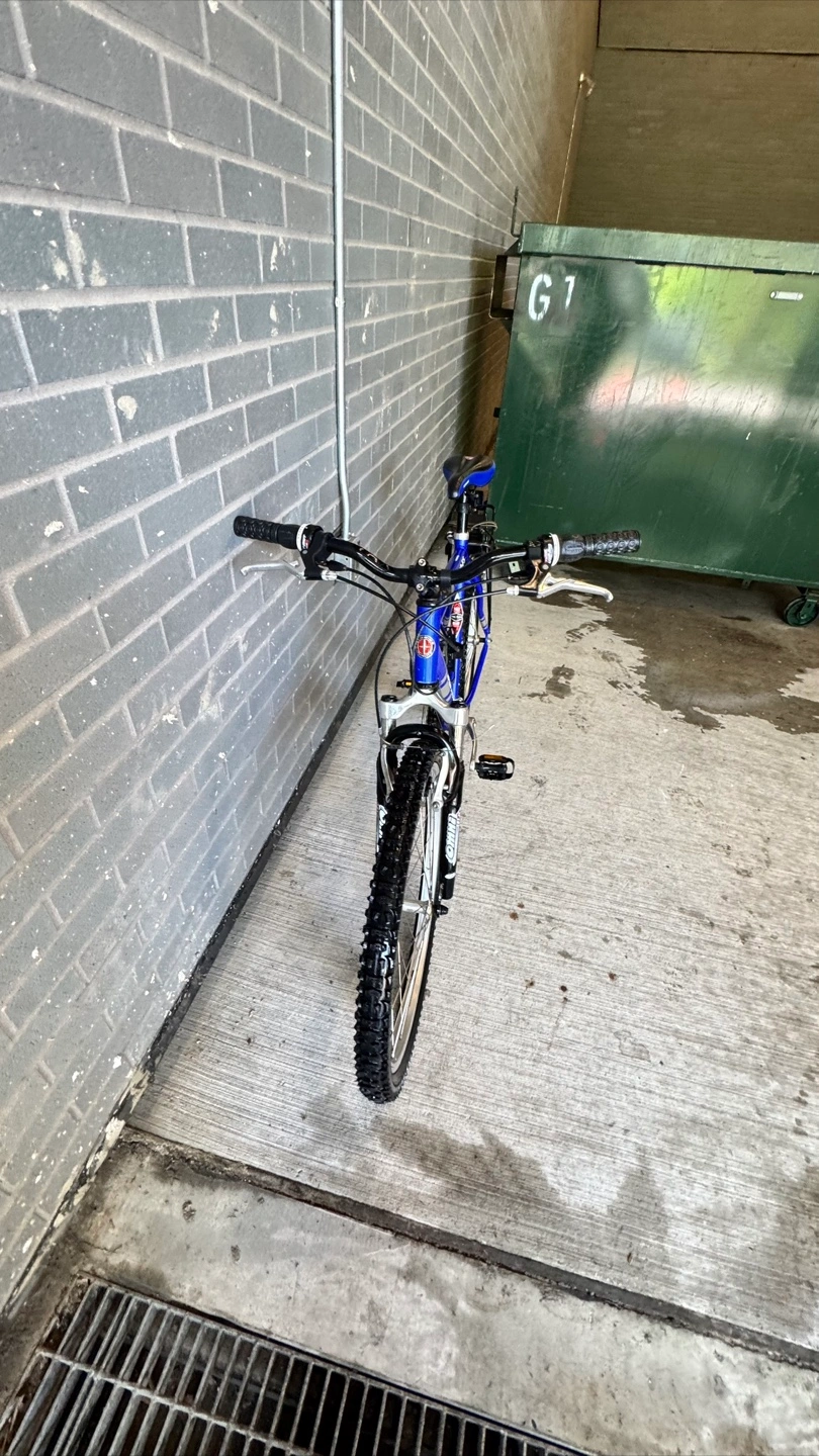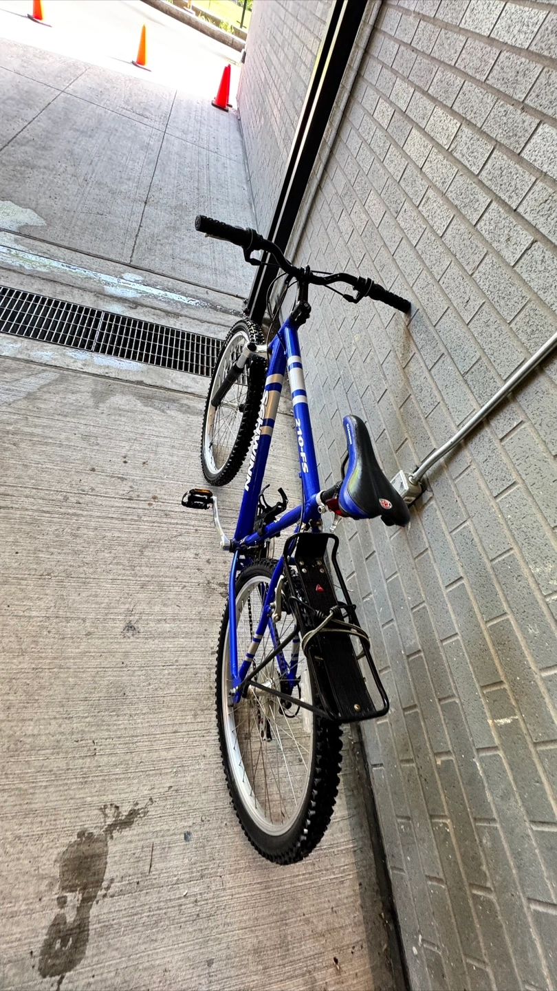 Schwinn 210-FS mountain bike. Blue frame. Front suspension forks. Rear rack. Good condition.