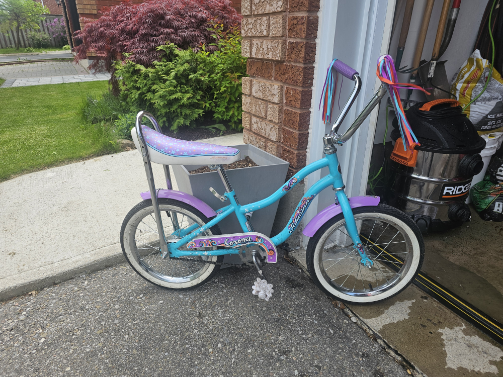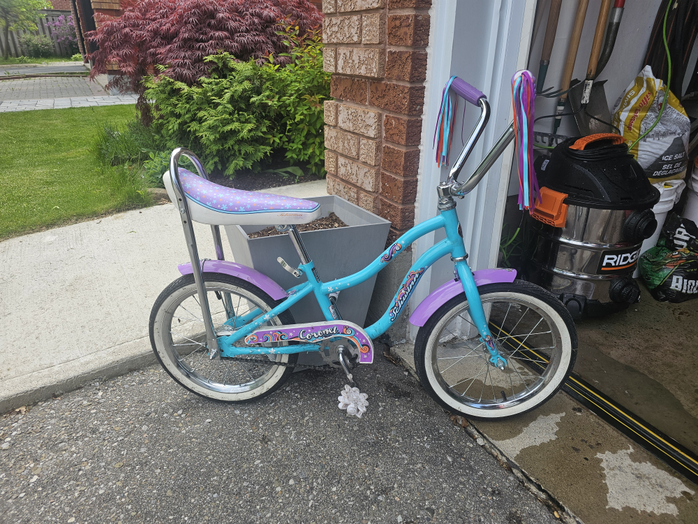 10Schwinn Coronet Kid's Bike features a high-tensile steel kid's frame with included training wheels Rear coaster brake offers intuitive, easy stopping for learning cyclists Single-speed drivetrain keeps things simple Printed banana seat and fenders for an added touch of style SmartStart™ means a more comfortable bike, made to a child's proportions Rear bar for added safety 16\" (40.6 cm) wheel typically fits riders age 3-5, or 38\" to 48\" (96.5 to 121.9 cm) tall Market price is $129.99. https://www.canadiantire.ca/en/pdp/schwinn-coronet-kid-s-bike-16-in-single-speed-training-wheels-3997357p.html