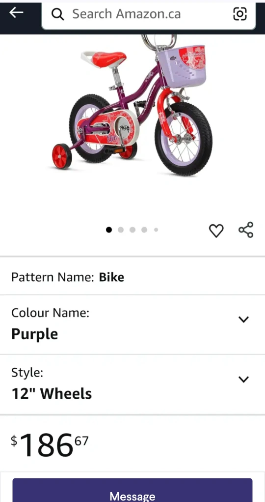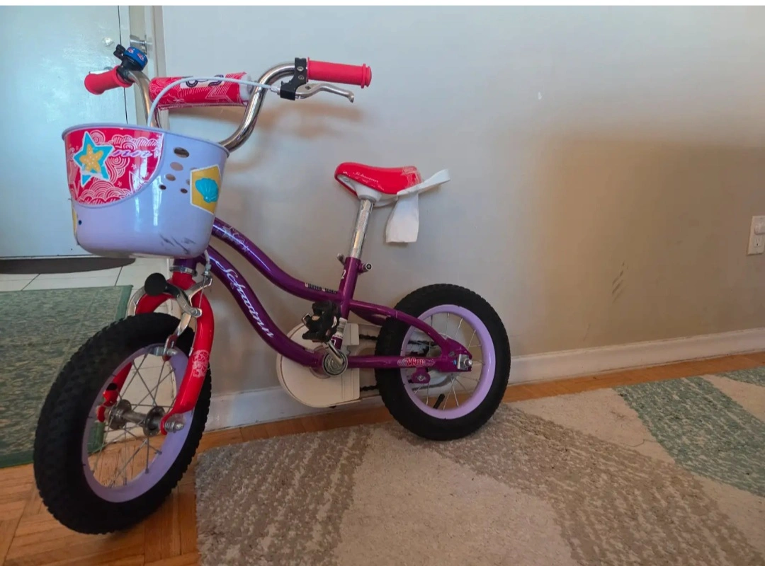 Selling a Schwinn Elm kids bike with 12" wheels (used_ good condition). It's purple and red, and comes with a cute basket on the front. Training wheels are included, making it perfect for little ones learning to ride! If interested please text to 6478323202