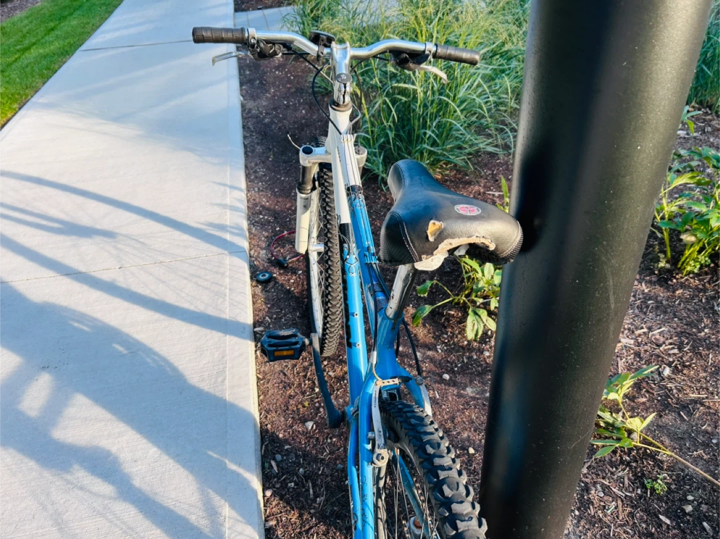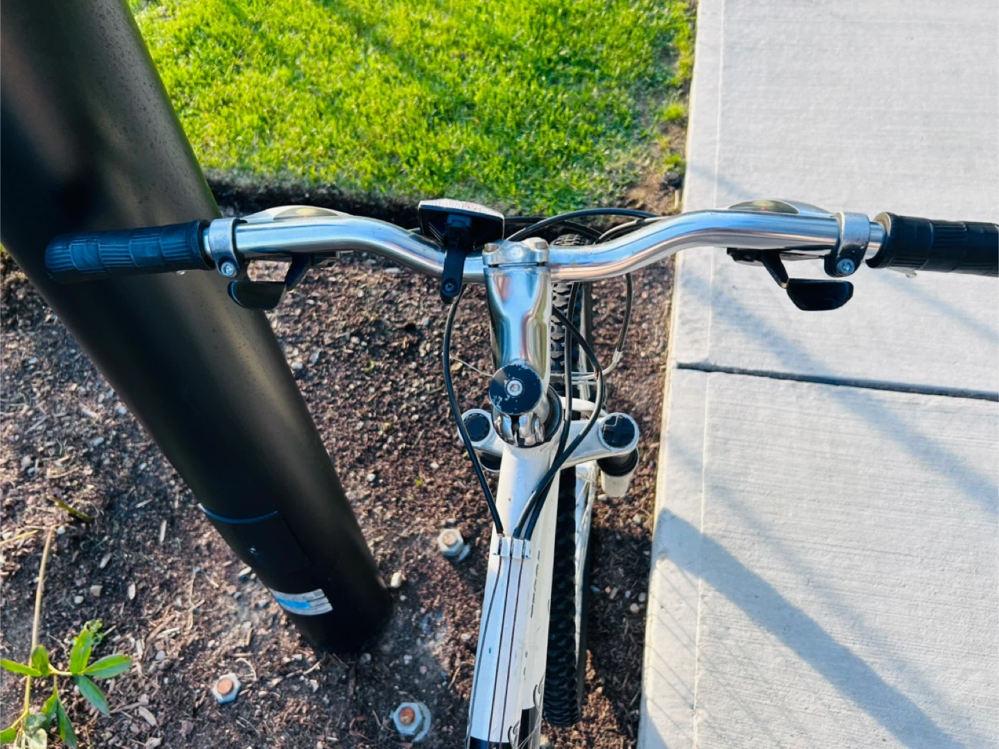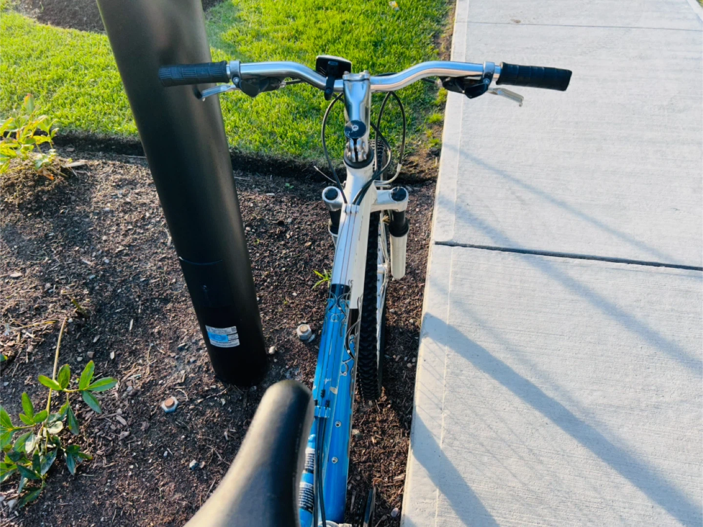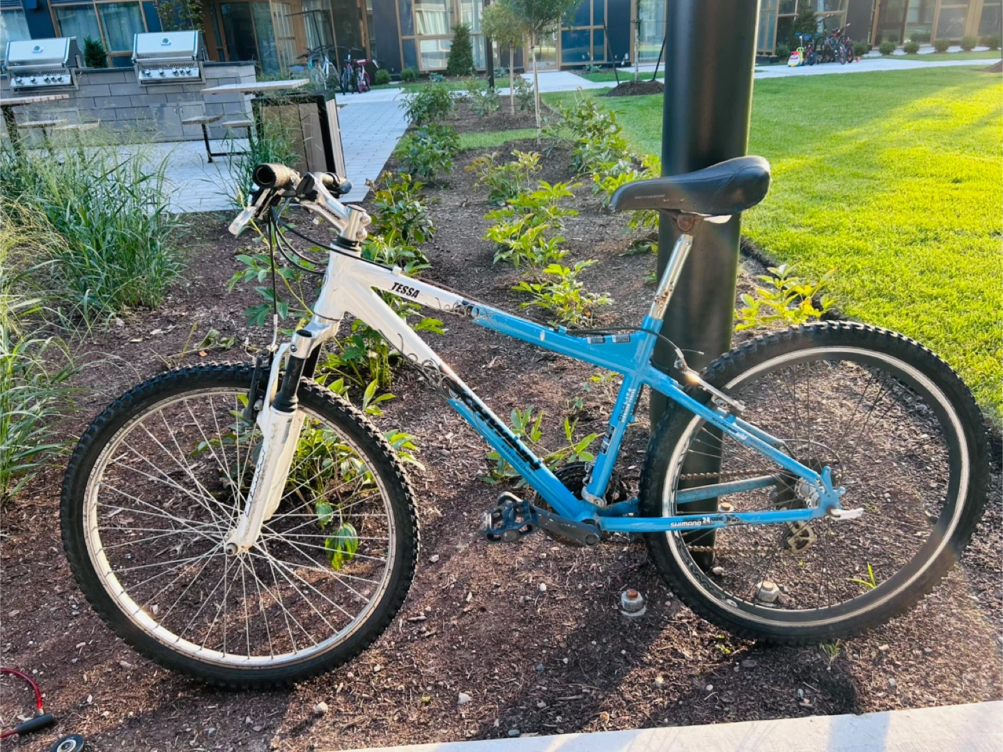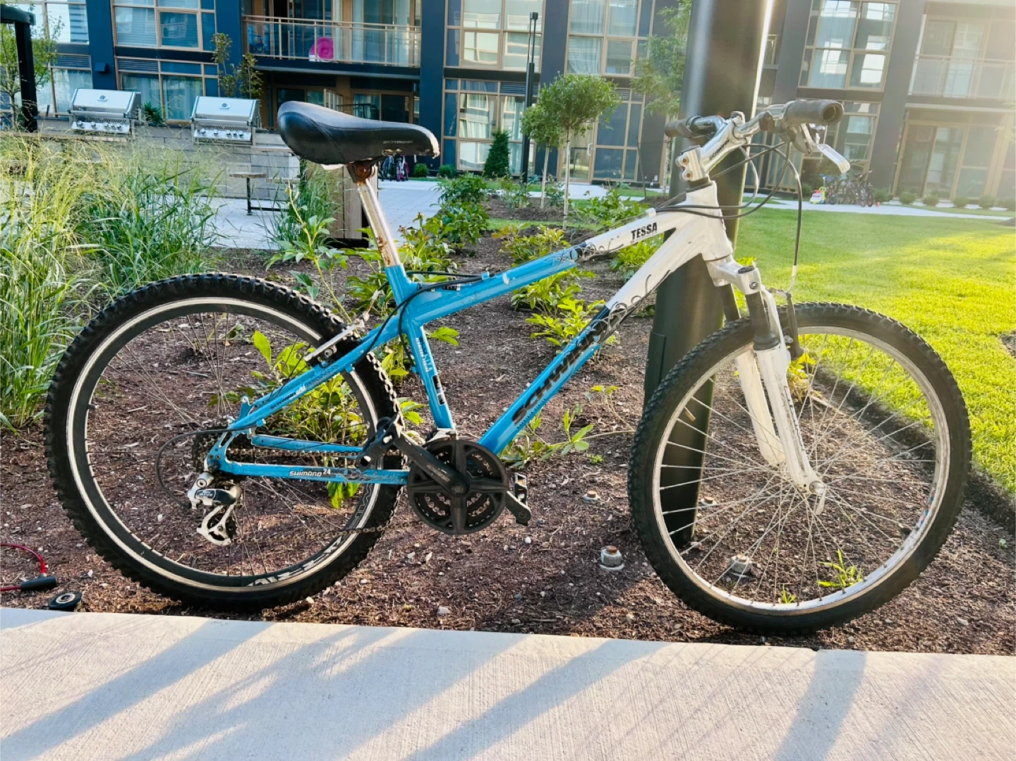 Selling a Schwinn Tessa mountain bike in a cool blue and white colour scheme. It's a great bike for getting around town or hitting some trails. The seat has some wear and tear, but the bike is otherwise in good condition and ready to ride!