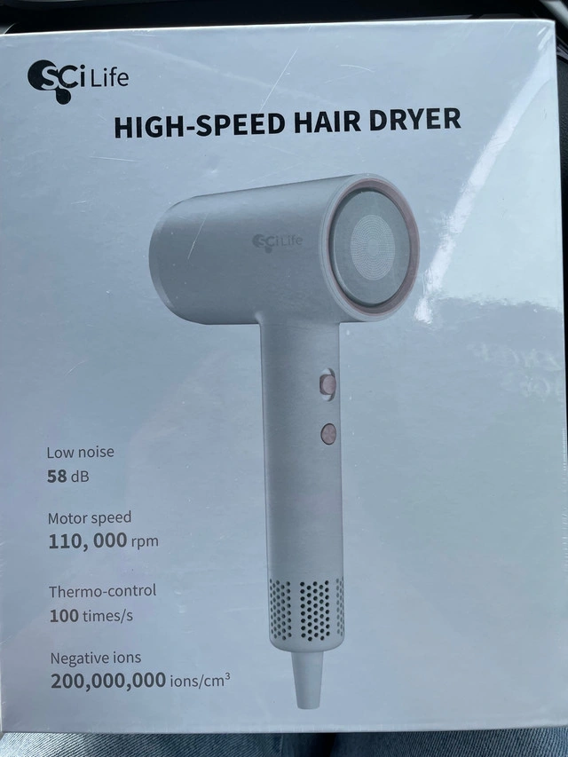 New high speed ionic hair dryer with wall mount holder. Magnetic, professional blow dryer with 110,000 RPM brushless motor for fast drying. 1400W, 4 temps / 2 speeds, low noise, thermo-control. White with holder.