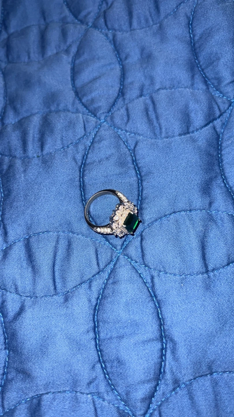 Selling an elegant emerald ring. The ring features a beautiful green emerald stone surrounded by sparkling details. It's perfect for adding a touch of sophistication to any outfit