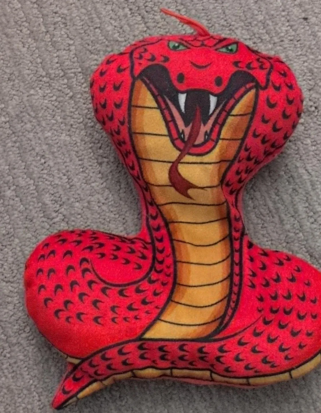 This is a soft, plush toy shaped like a red cobra snake. It features a vibrant red exterior with black scale details and a yellow underside. The snake has a distinct hood, green eyes, and a forked red tongue sticking out.