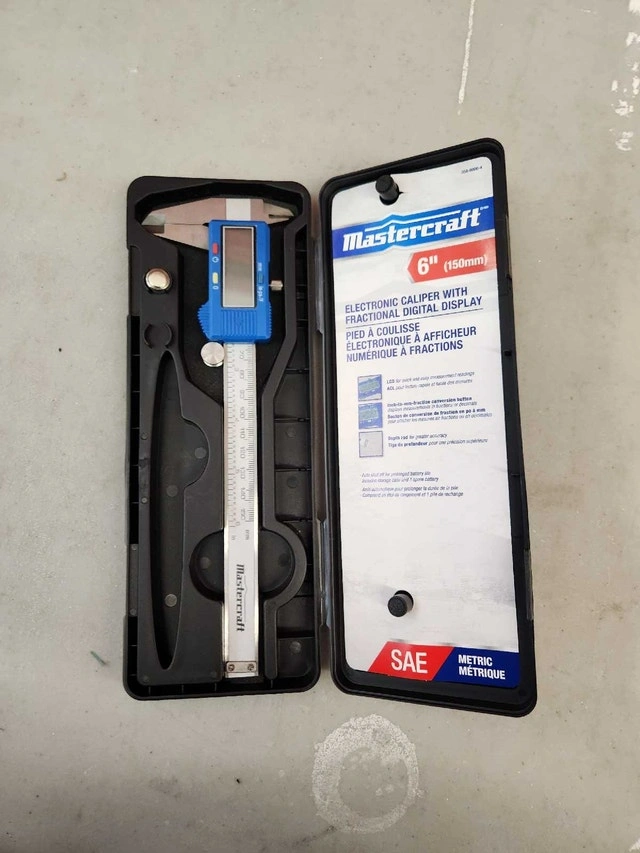 This Mastercraft 6" (150mm) electronic caliper with fractional digital display is in used-good condition. It's perfect for precise measurements in both SAE and Metric units, and comes with its original case. I've taken good care of it, and it's ready for your next project. Measures in both SAE and Metric units, Fractional digital display, 6" (150mm) capacity, Original case included. Similar calipers sell for around $20-$40 online, so I've priced this for a quick sale. If you're seeing this ad, the caliper is still available.