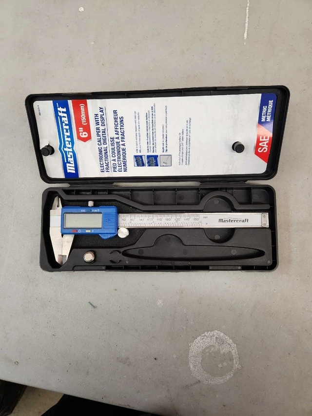 This Mastercraft 6" (150mm) electronic caliper with fractional digital display is in used-good condition. It's perfect for precise measurements in both SAE and Metric units, and comes with its original case. I've taken good care of it, and it's ready for your next project. Measures in both SAE and Metric units, Fractional digital display, 6" (150mm) capacity, Original case included. Similar calipers sell for around $20-$40 online, so I've priced this for a quick sale. If you're seeing this ad, the caliper is still available.