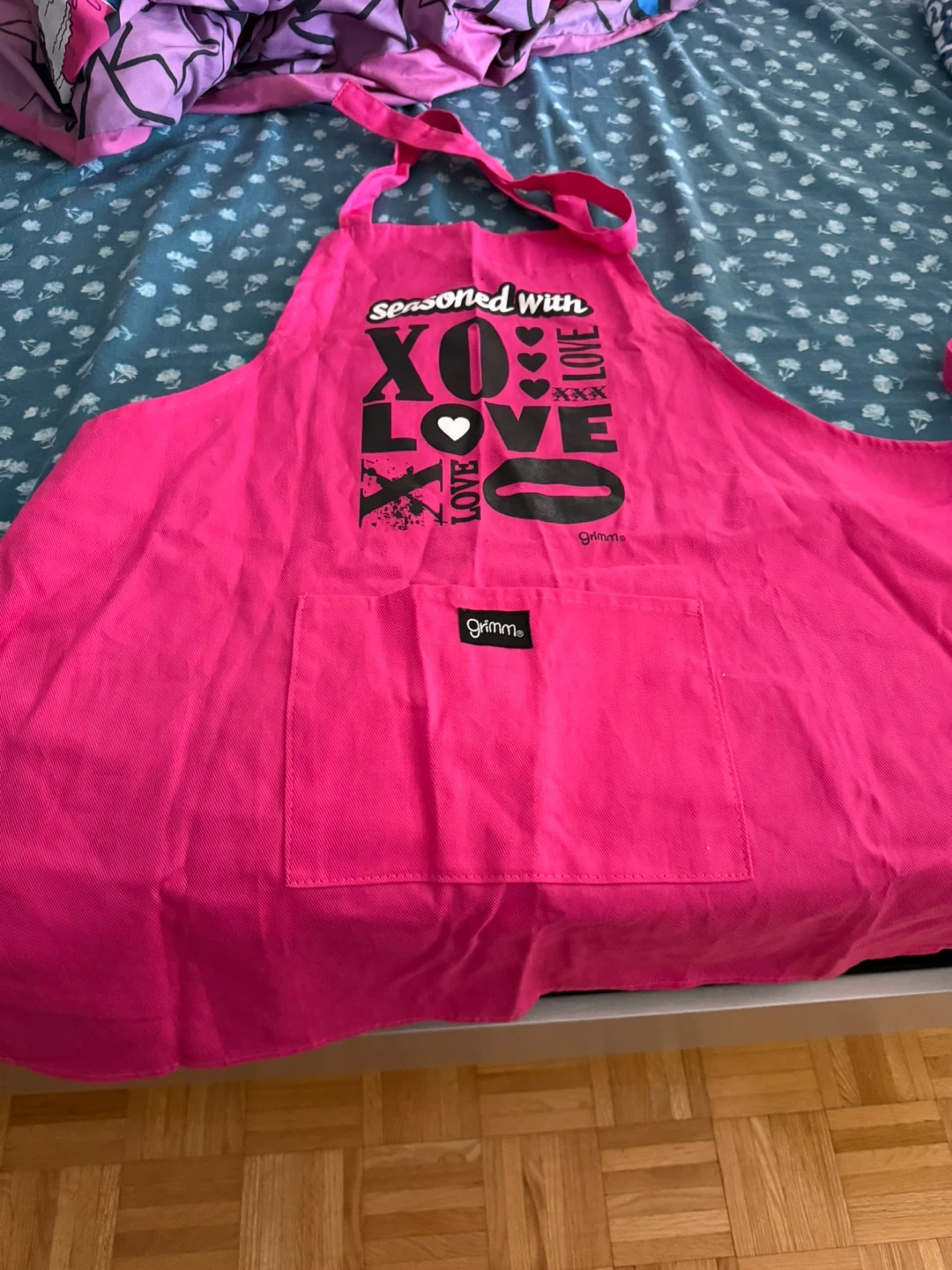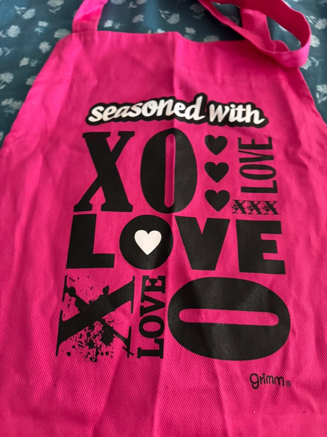 This bright pink apron features a bold "XO LOVE" graphic with "seasoned with" text at the top. It has a handy front pocket and adjustable neck strap for a comfy fit. Cotton material.