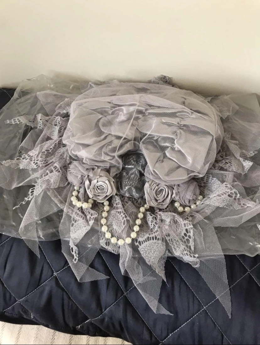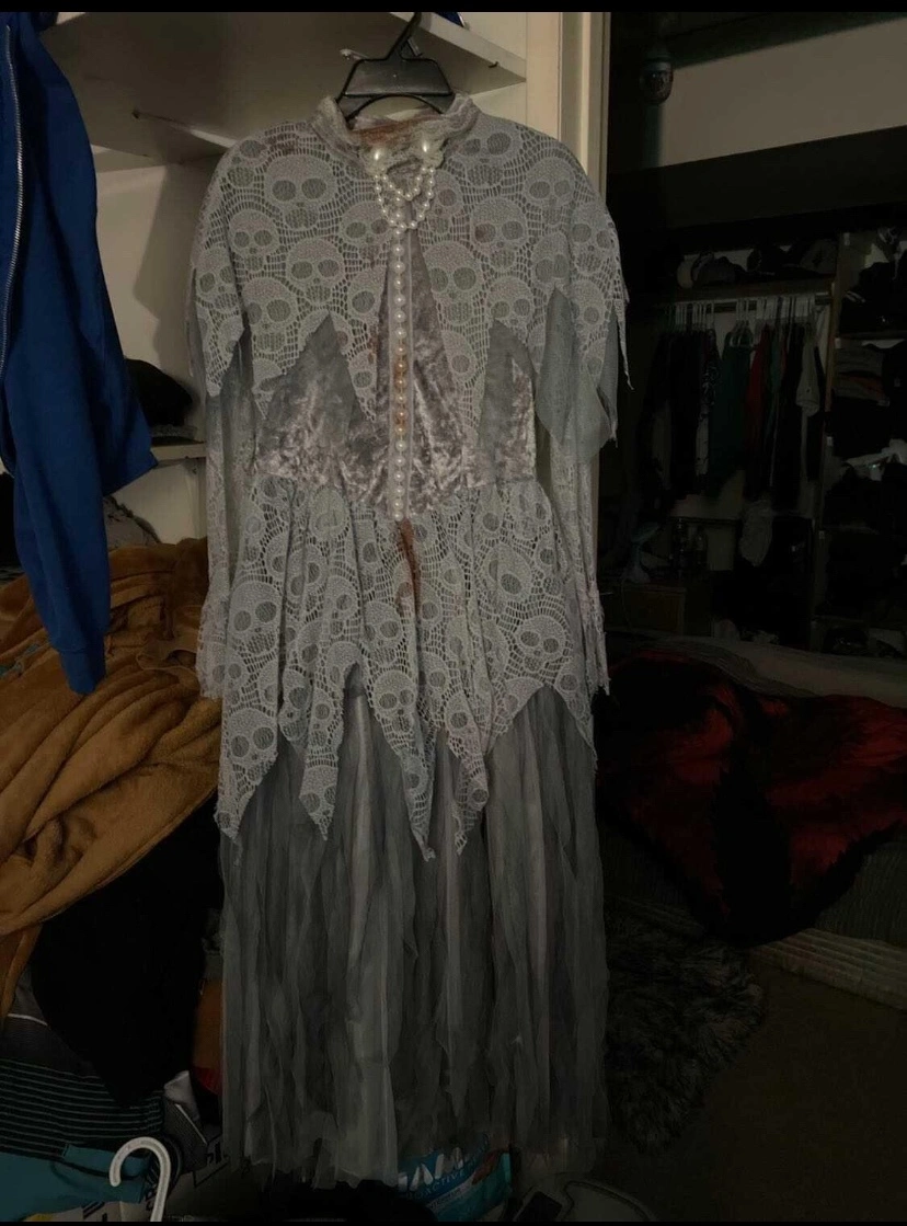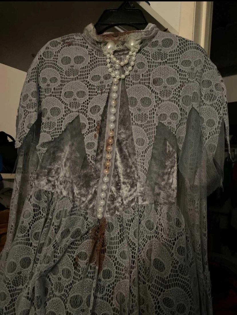 Skull dress and hat halloween costume. Used once and got some fake blood stains on the dress as shown in the pictures. The hat is in really good condition. When I bought it said it was for a 11-13 year old. OBO