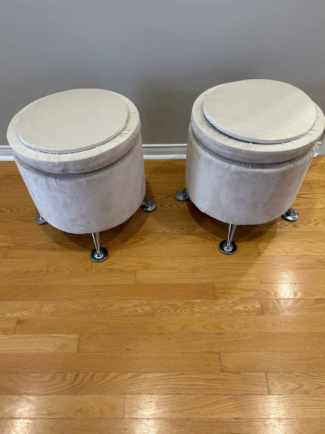 A matching pair of ottomans retro style in a neutral colour, faux suede. Ottoman seat can be reversed to use as a mini table. The base of each ottoman is supported by short, metal legs.