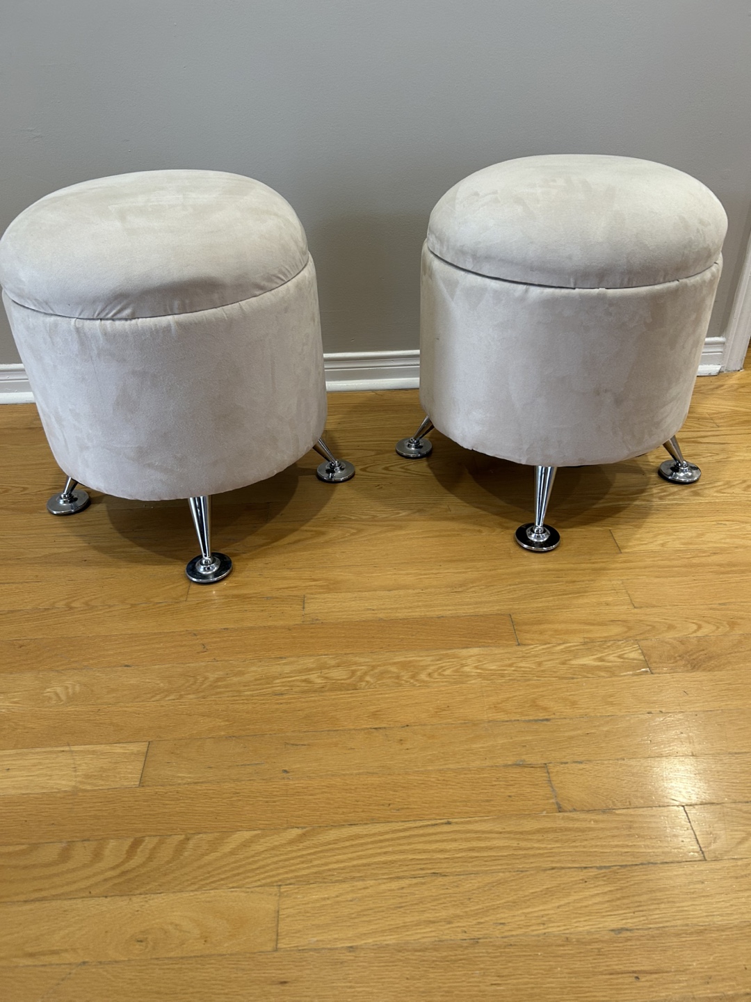 A matching pair of ottomans retro style in a neutral colour, faux suede. Ottoman seat can be reversed to use as a mini table. The base of each ottoman is supported by short, metal legs.