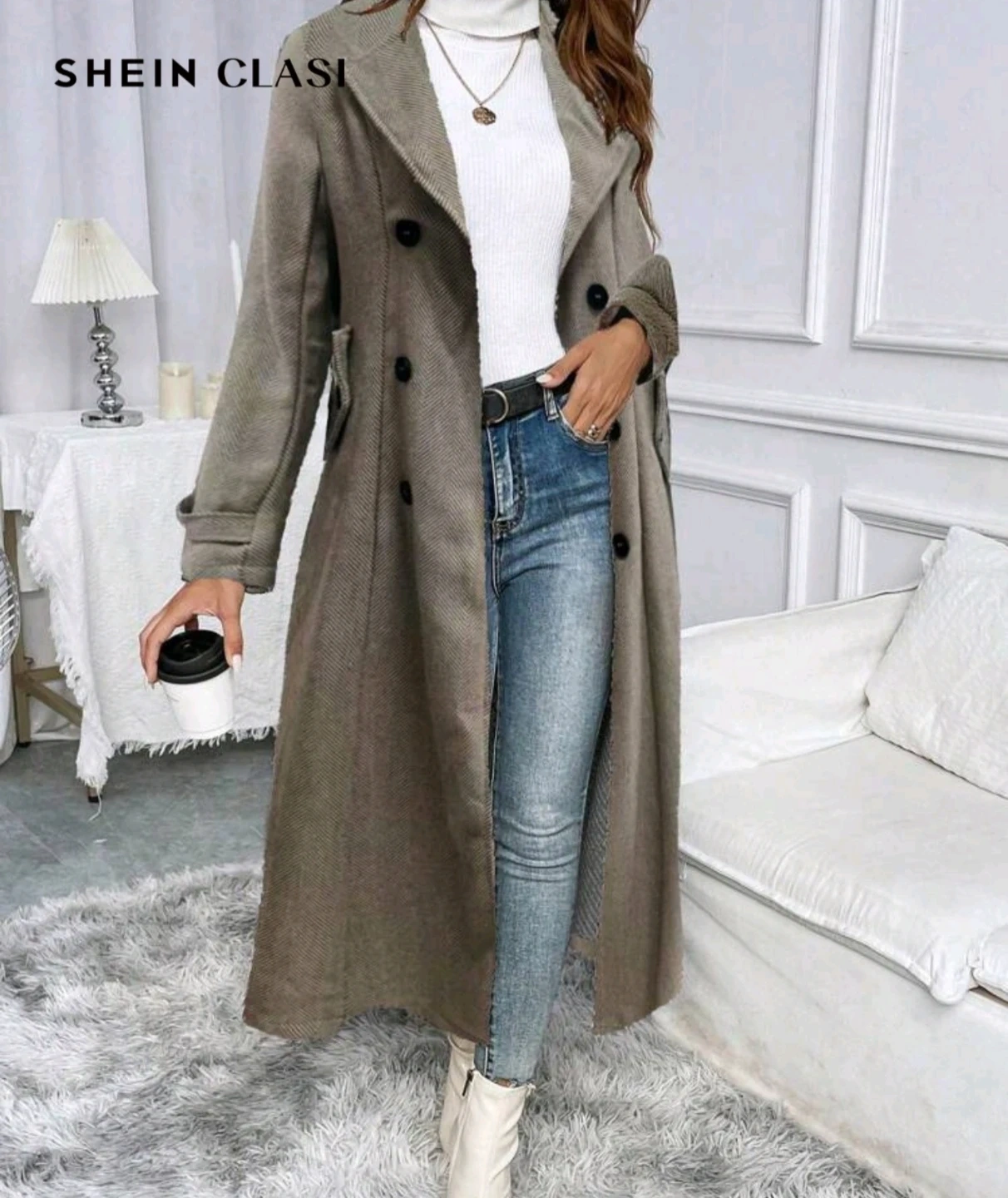 Stay warm and stylish in this women's herringbone coat. It features a double-breasted closure and a long silhouette. The coat is made from a wool blend fabric for comfort and warmth. It has two front pockets and a belted waist for a customizable fit.
