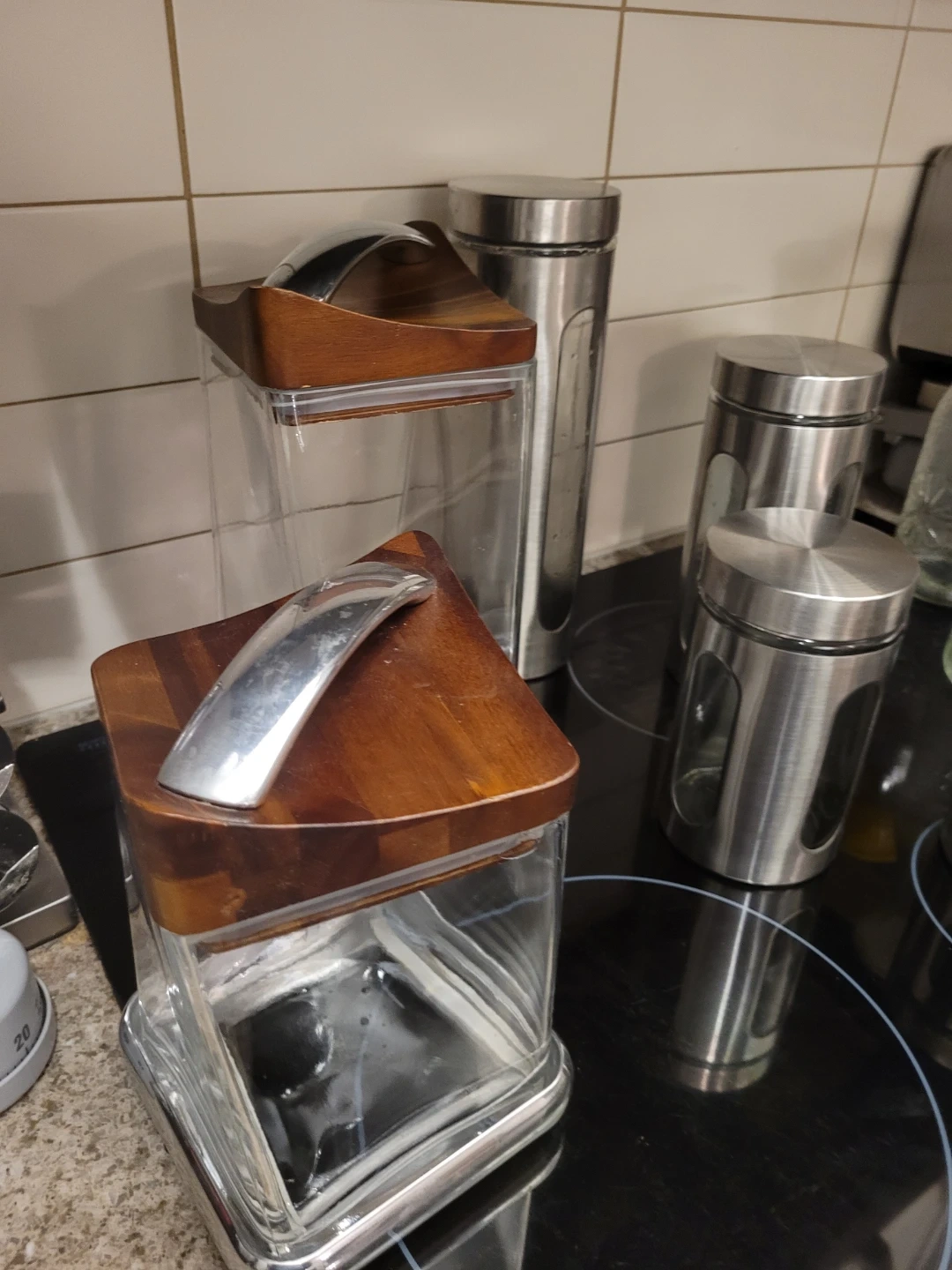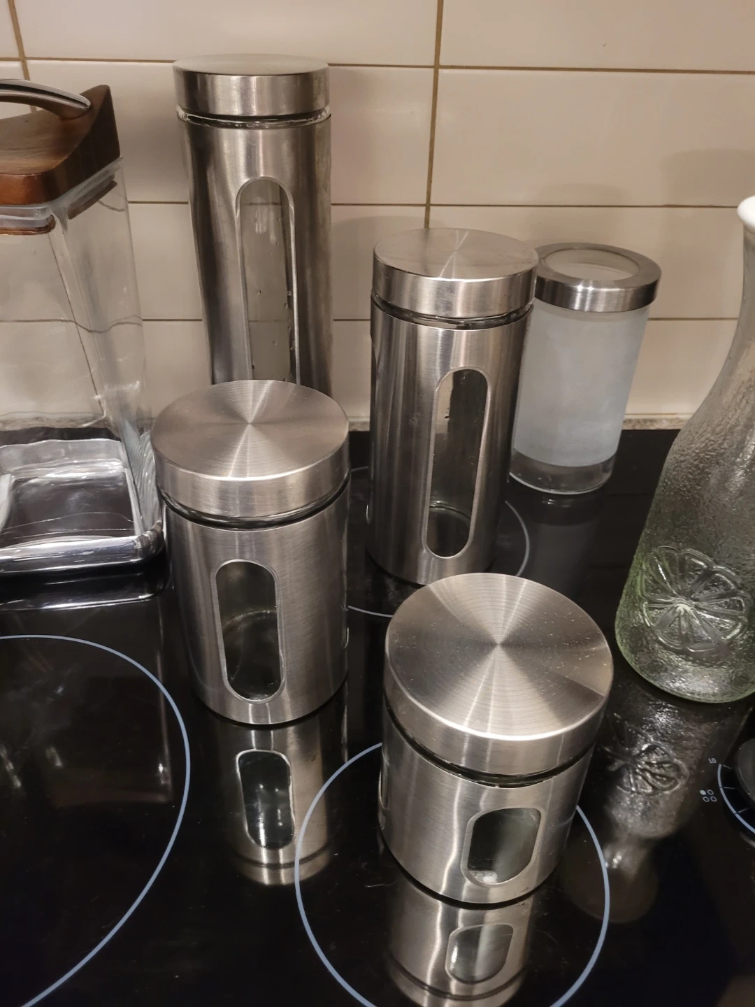 BUNDLE set NINE PIECES stainless steel canisters, each featuring a clear window to see contents. They're perfect for storing dry goods like coffee beans, tea, or sugar. Stainless steel construction.