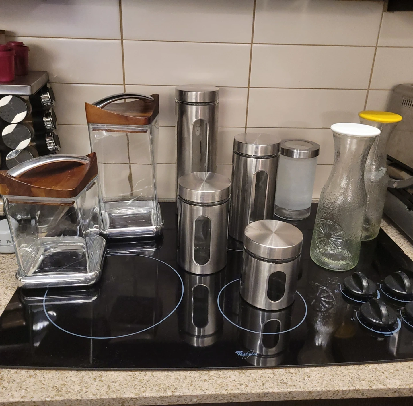 BUNDLE set NINE PIECES stainless steel canisters, each featuring a clear window to see contents. They're perfect for storing dry goods like coffee beans, tea, or sugar. Stainless steel construction.