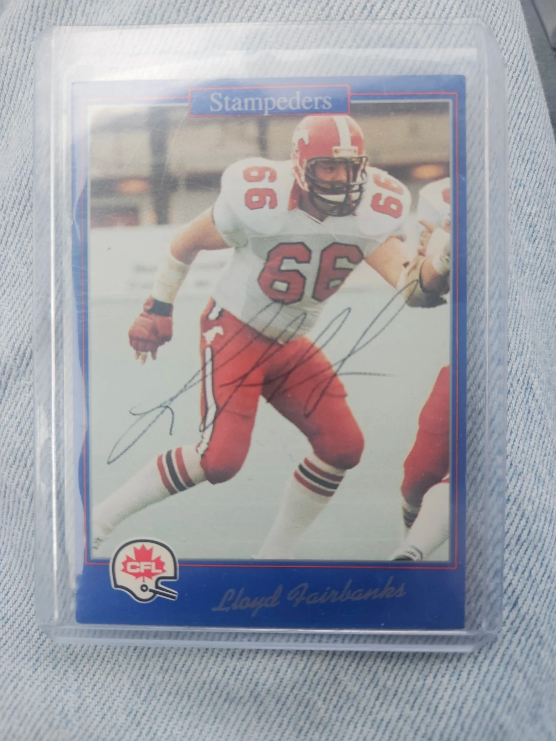 Selling a Lloyd Fairbanks #66 Stampeders card. It's signed and in great condition! The card is from JOGO INC./91. He played Offensive Tackle, standing at 6'4" and weighing 245 lbs. He played 17 years professionally and was named to the West Division ALL-STAR team in 1990
