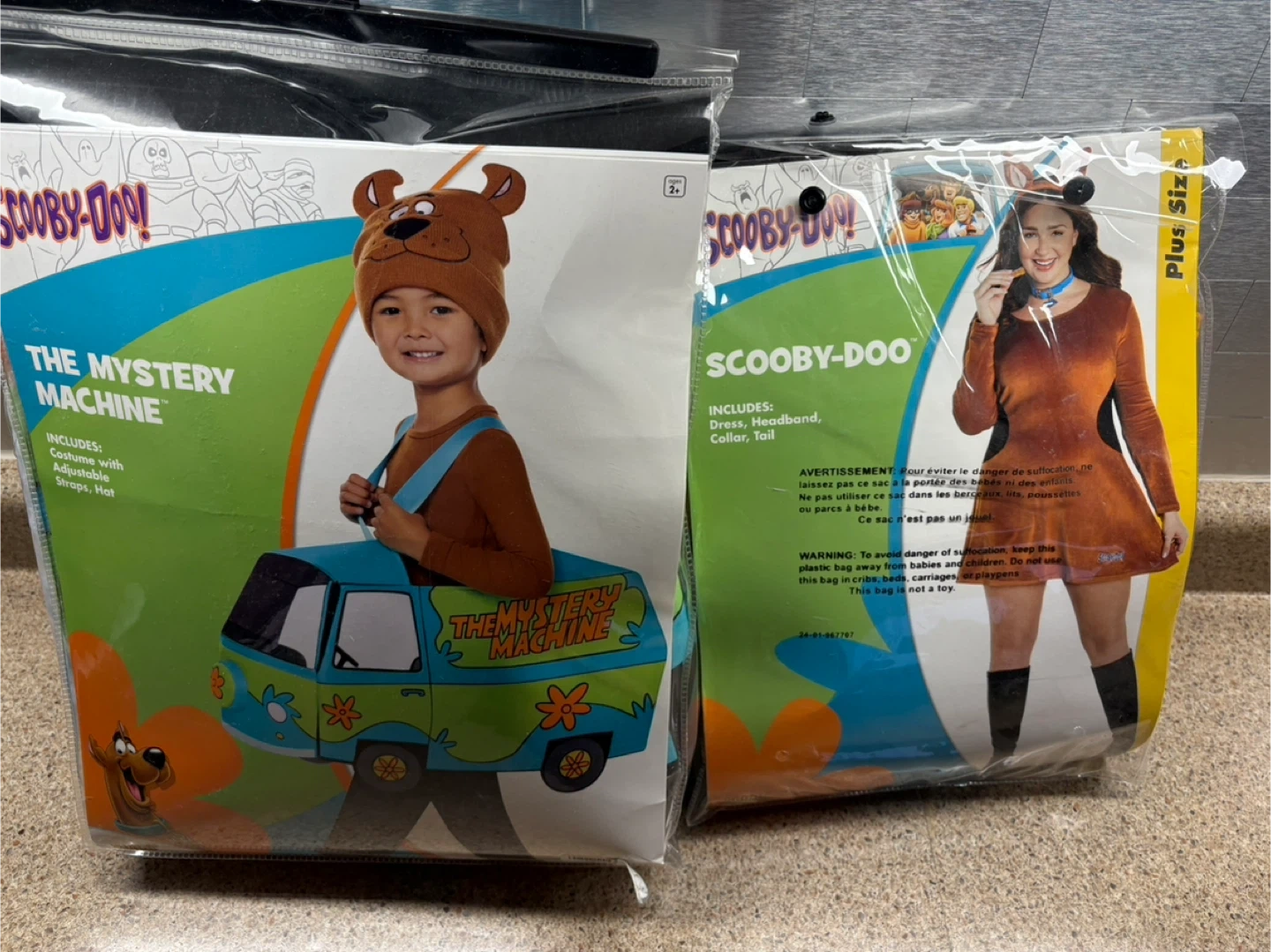 Selling two Scooby-Doo costumes! One is "The Mystery Machine" costume, suitable for ages 2+. The other is a plus-size Scooby-Doo costume that includes a dress, headband, collar, and tail. Both are in their original packaging. Trulls Nash area