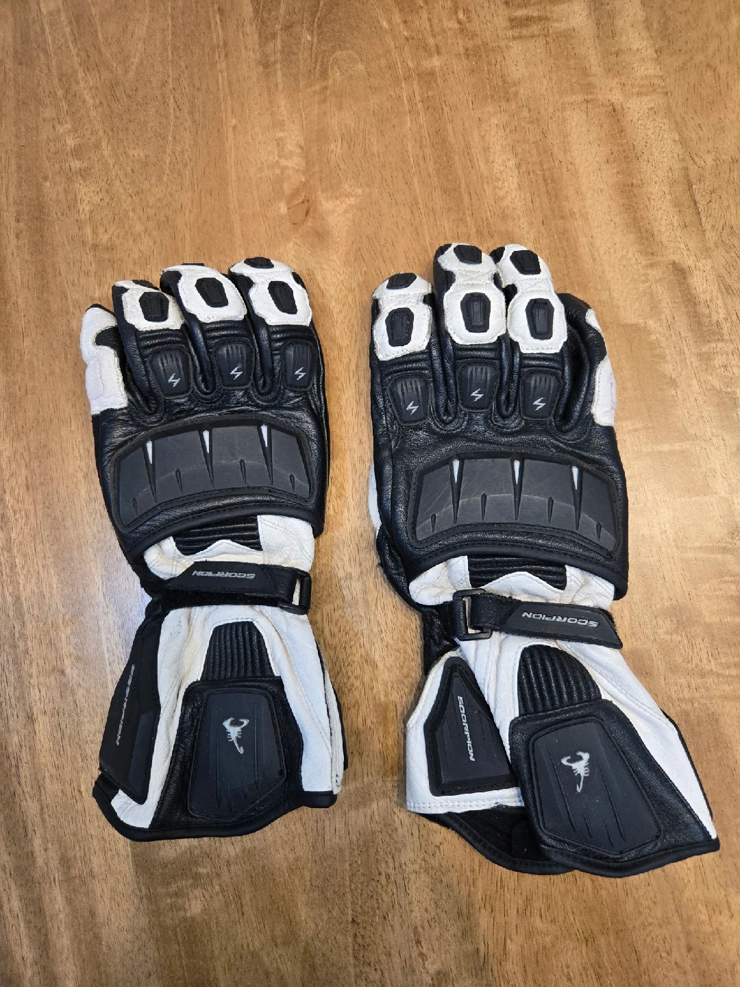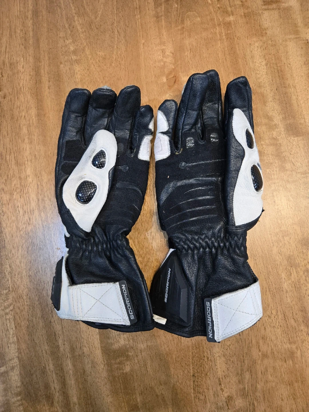 60Selling a pair of Scorpion motorcycle gloves in black and white. They're in decent shape and ready for your next ride!