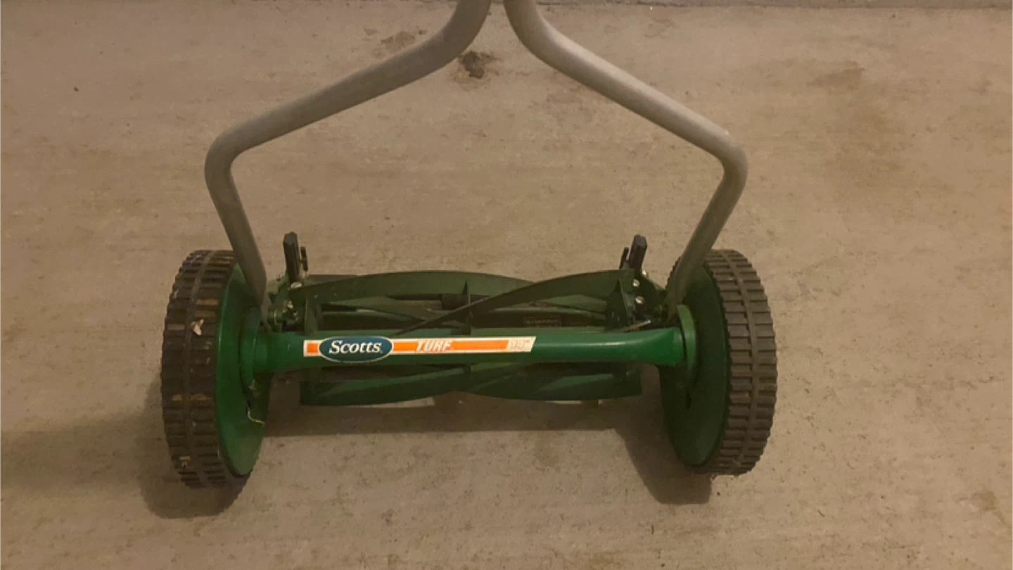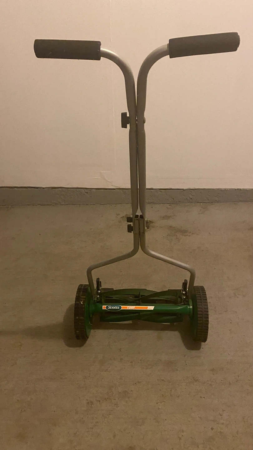 Selling a Scotts Turf reel mower. It's green and ready to help you keep your lawn looking great! It's a manual push mower, so no gas or electricity needed. Perfect for small yards or anyone looking for a more eco-friendly option