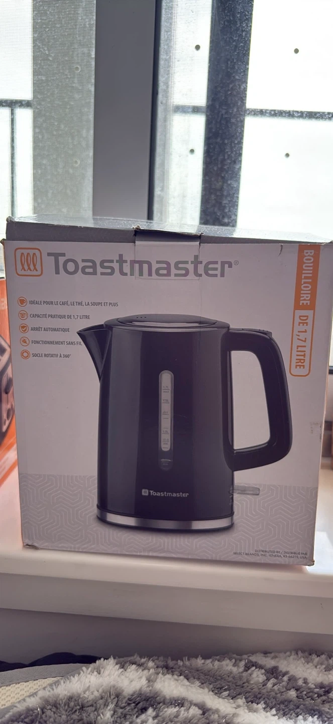 Selling a Toastmaster kettle with a 1.7L capacity! It's in like-new condition and comes with the original box. It's ideal for making coffee, tea, soup, and more! It features automatic shut-off, cordless operation, and a 360° swivel base