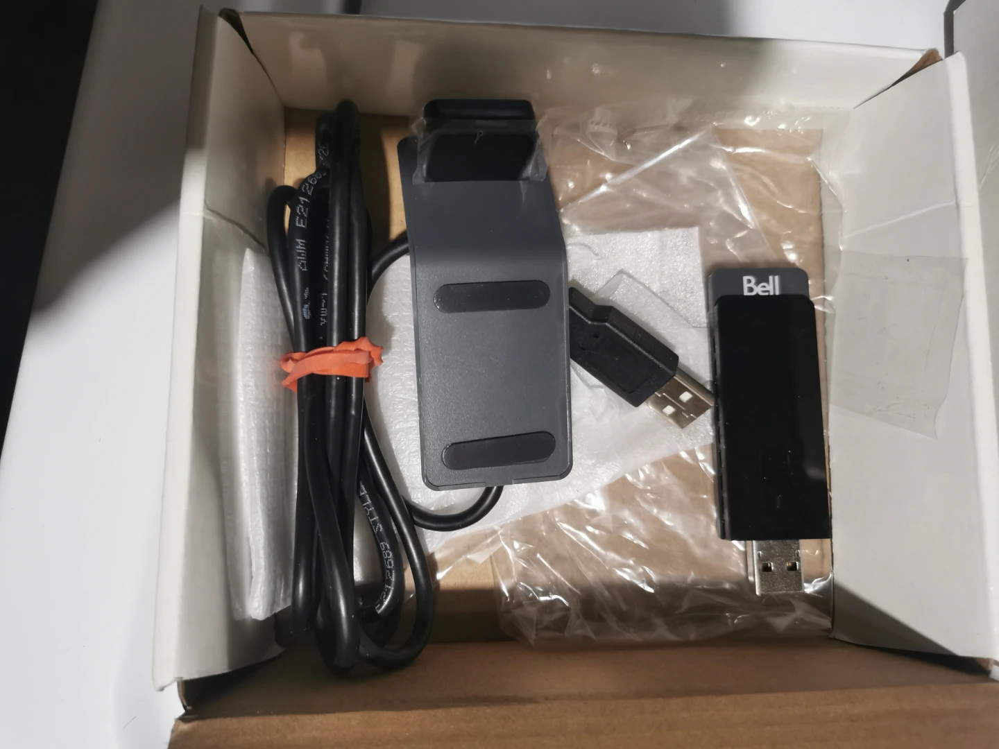Bell Satellite TV Wi-Fi Adapter. Includes the adapter, USB cable, and stand. All components are in the original box.